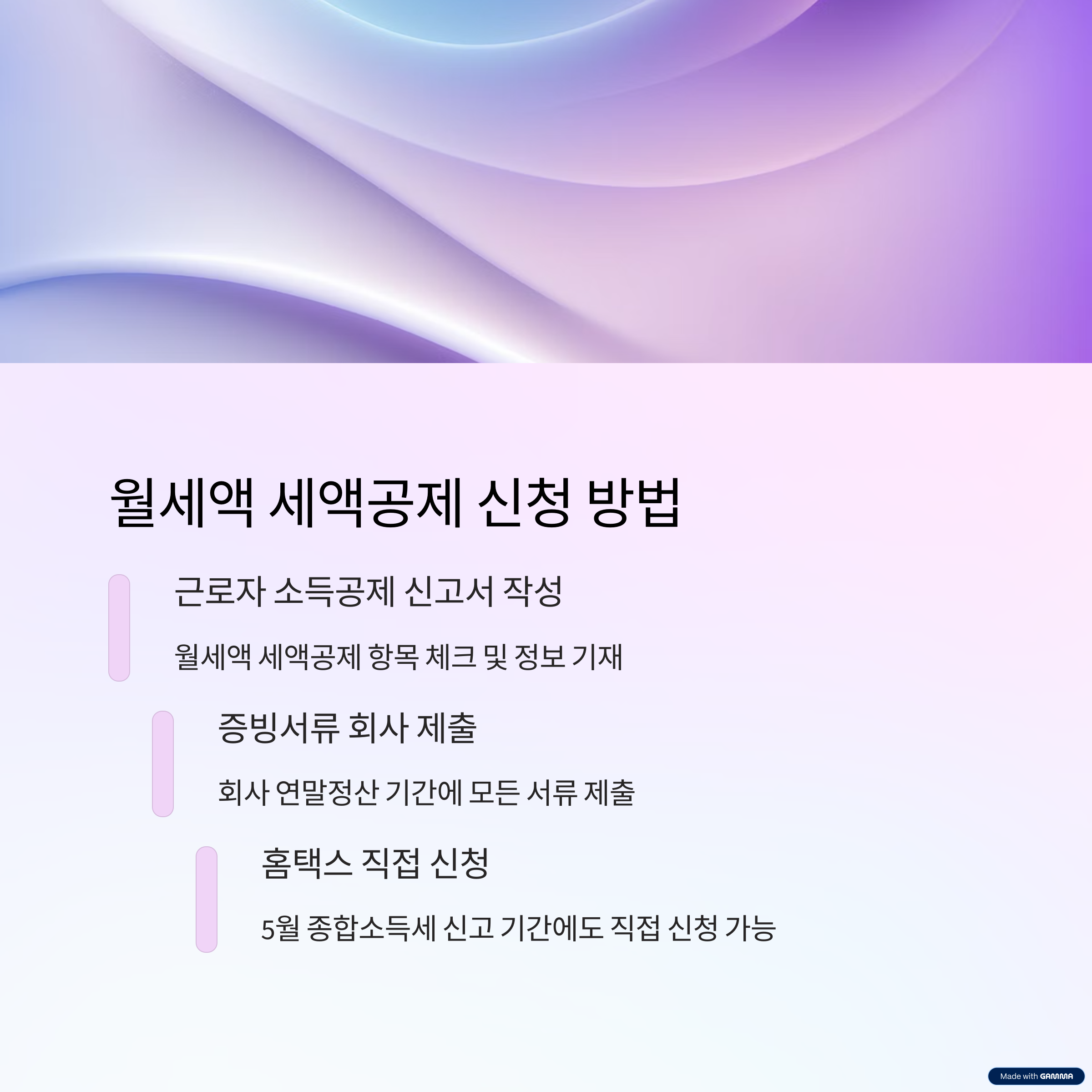 월세액 세액공제는 저소득 무주택자에게 특히 유용한 세금 혜택입니다. 조건을 충족하신다면 꼭 신청하여 세금 부담을 줄이고 가계 경제에 도움을 받으시기 바랍니다.