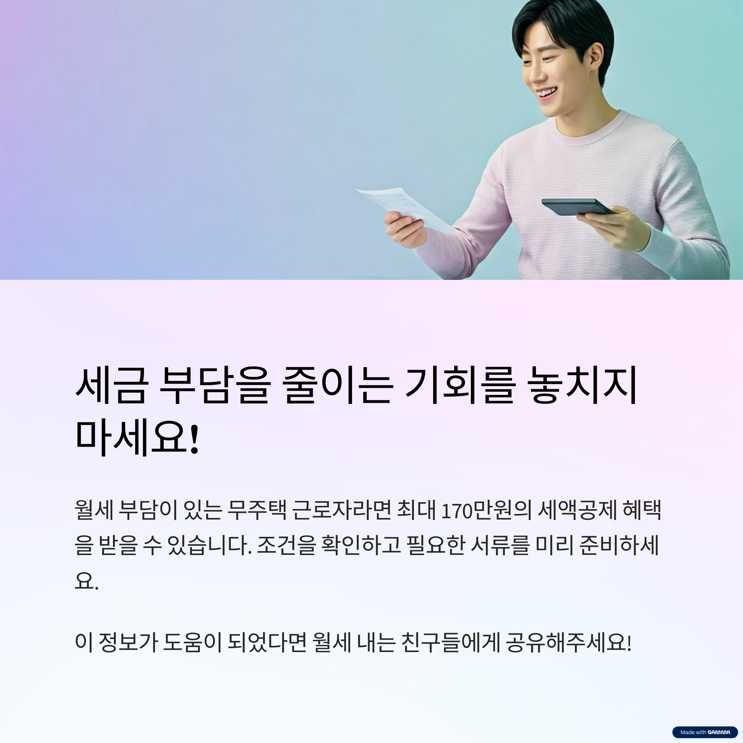 무주택자분들을 위한 유용한 세금 혜택, 월세액 세액공제에 대해 알려드립니다. 2025년 기준으로 최대 170만원의 세금 감면 혜택을 받을 수 있는 이 제도는 주거비 부담을 덜어주는 중요한 정책입니다.