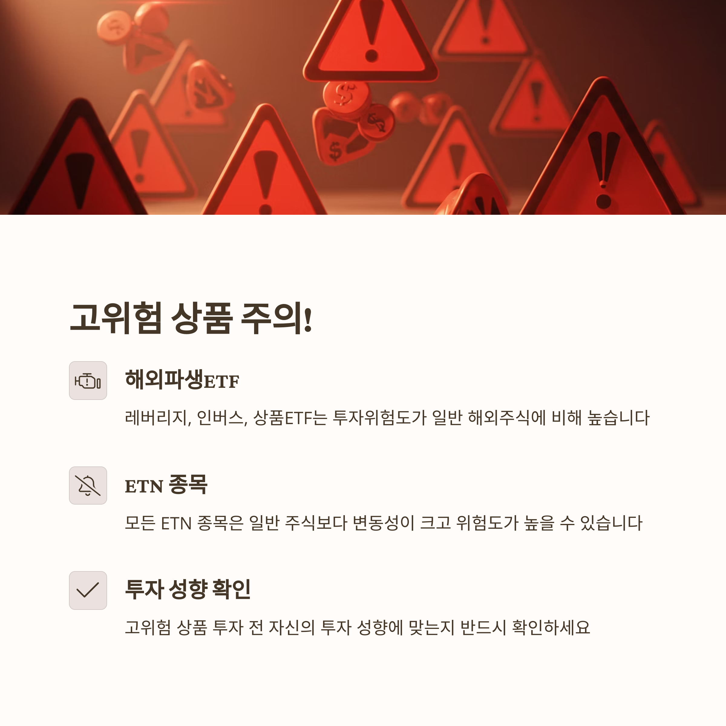 - 높은 위험의 상품: 해외파생ETF(레버리지, 인버스, 상품ETF) 및 모든 ETN 종목은 투자위험도가 일반 해외주식에 비해 높으므로 투자 성향에 맞는지 확인하세요.