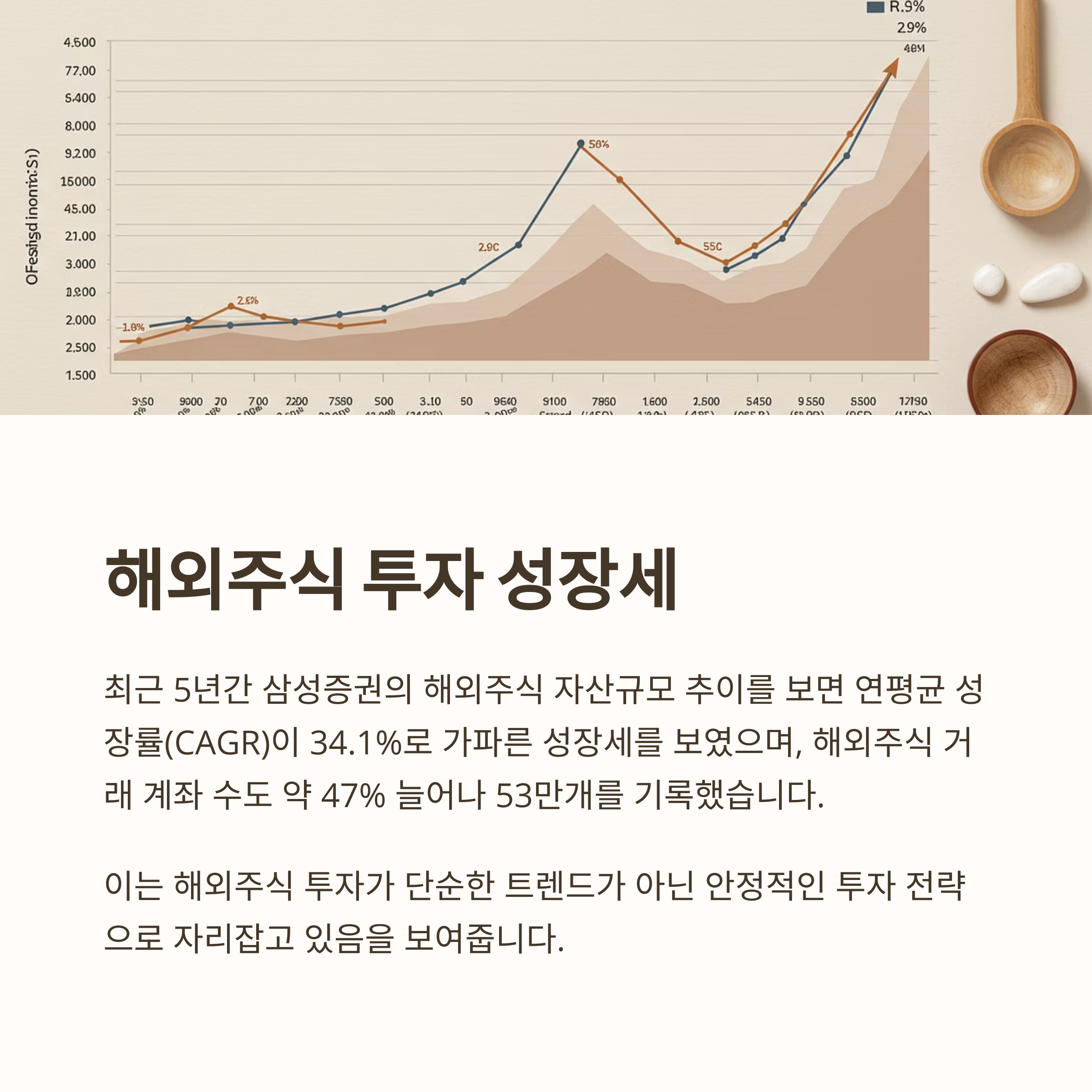 최근 5년간 삼성증권의 해외주식 자산규모 추이를 보면 연평균 성장률(CAGR)이 34.1%로 가파른 성장세를 보였으며, 해외주식 거래 계좌 수도 약 47% 늘어나 53만개를 기록했습니다. 이는 해외주식 투자가 단순한 트렌드가 아닌 안정적인 투자 전략으로 자리잡고 있음을 보여줍니다.