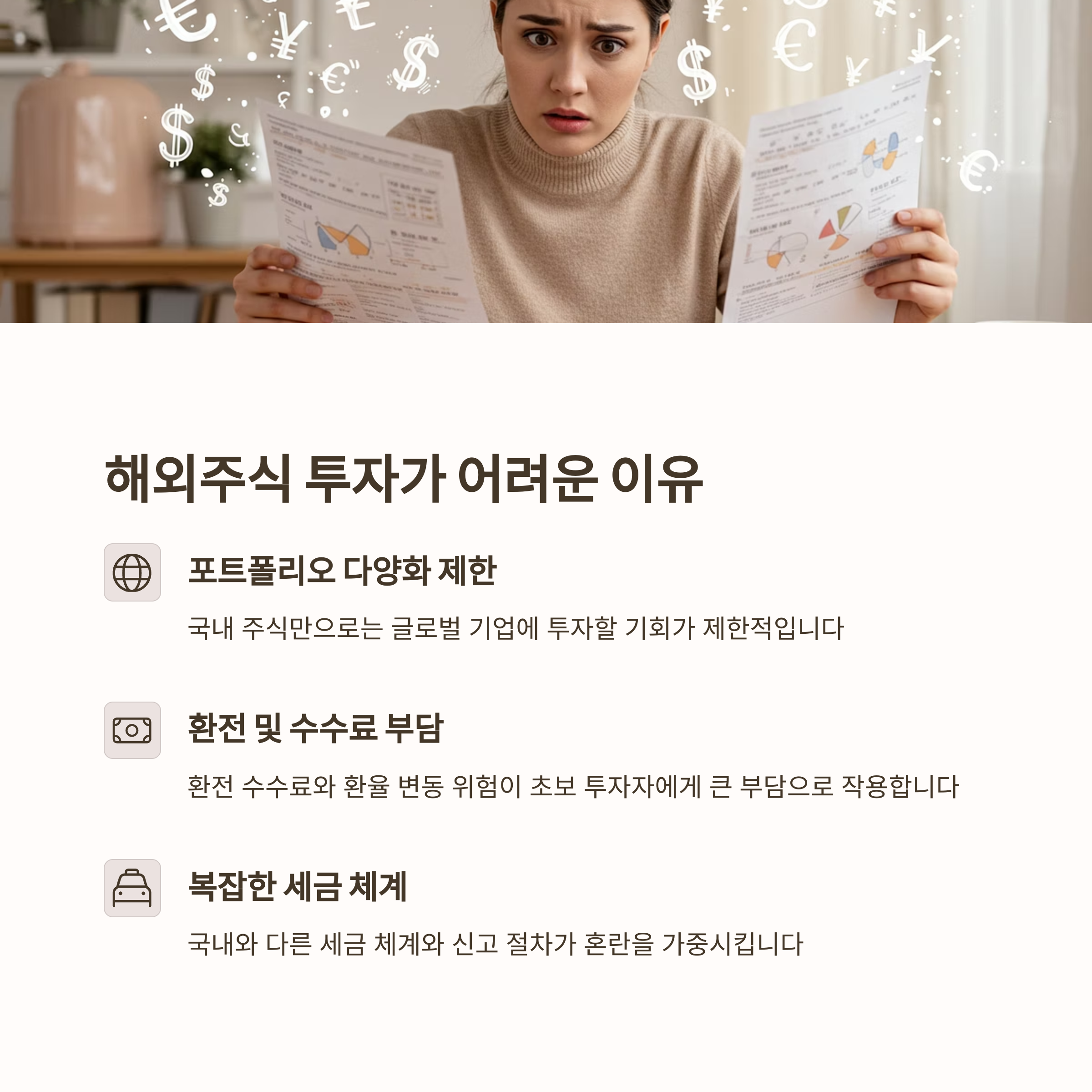 특히 해외주식 투자 시 발생하는 환전 수수료와 환율 변동 위험은 초보 투자자들에게 큰 부담으로 작용하곤 합니다. 또한 국내와 다른 세금 체계와 신고 절차도 혼란을 가중시키는 요소입니다.