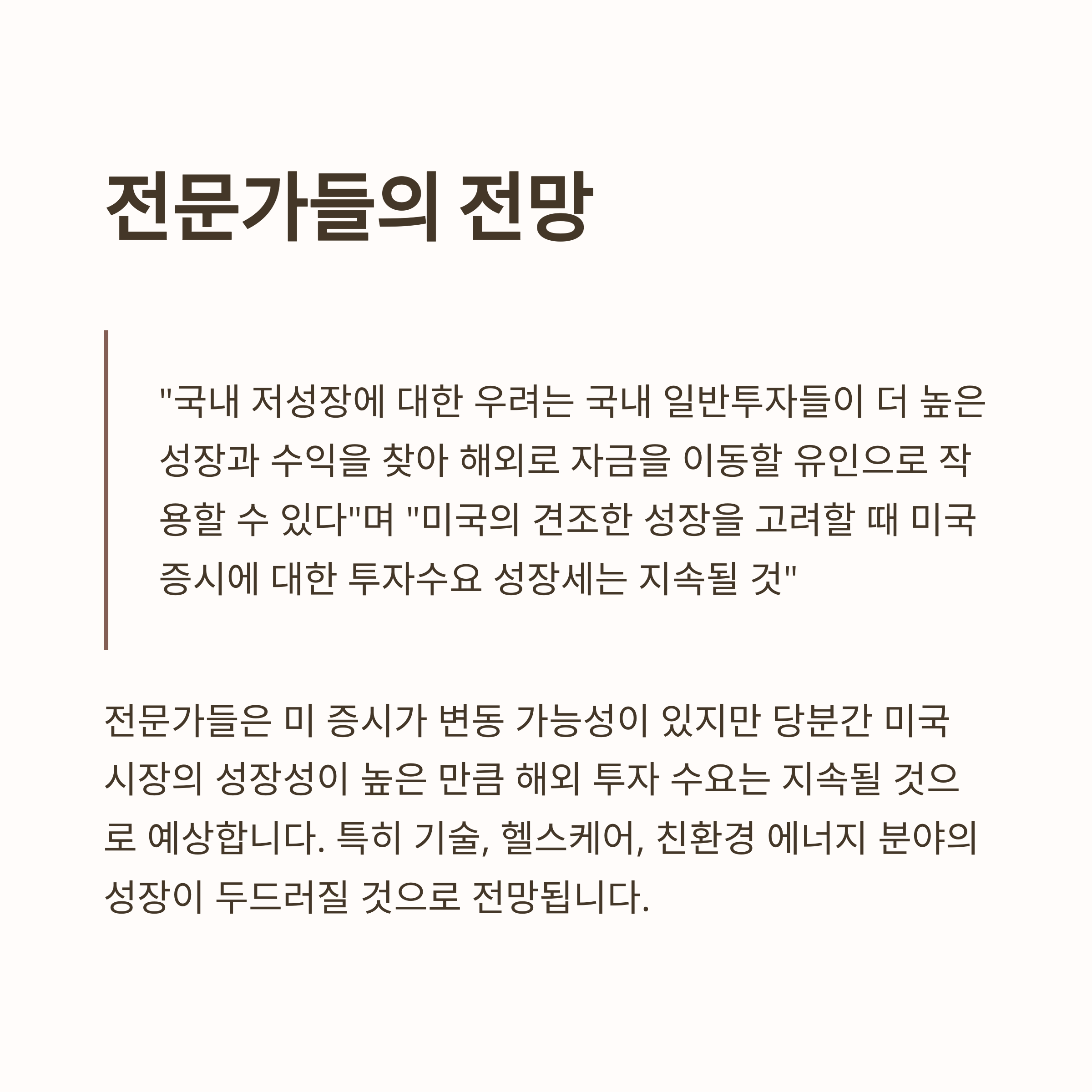 전문가들은 미 증시가 변동 가능성이 있지만 당분간 미국 시장의 성장성이 높은 만큼 해외 투자 수요는 지속될 것으로 예상합니다. "국내 저성장에 대한 우려는 국내 일반투자들이 더 높은 성장과 수익을 찾아 해외로 자금을 이동할 유인으로 작용할 수 있다"며 "미국의 견조한 성장을 고려할 때 미국증시에 대한 투자수요 성장세는 지속될 것"이라는 전망이 나오고 있습니다.