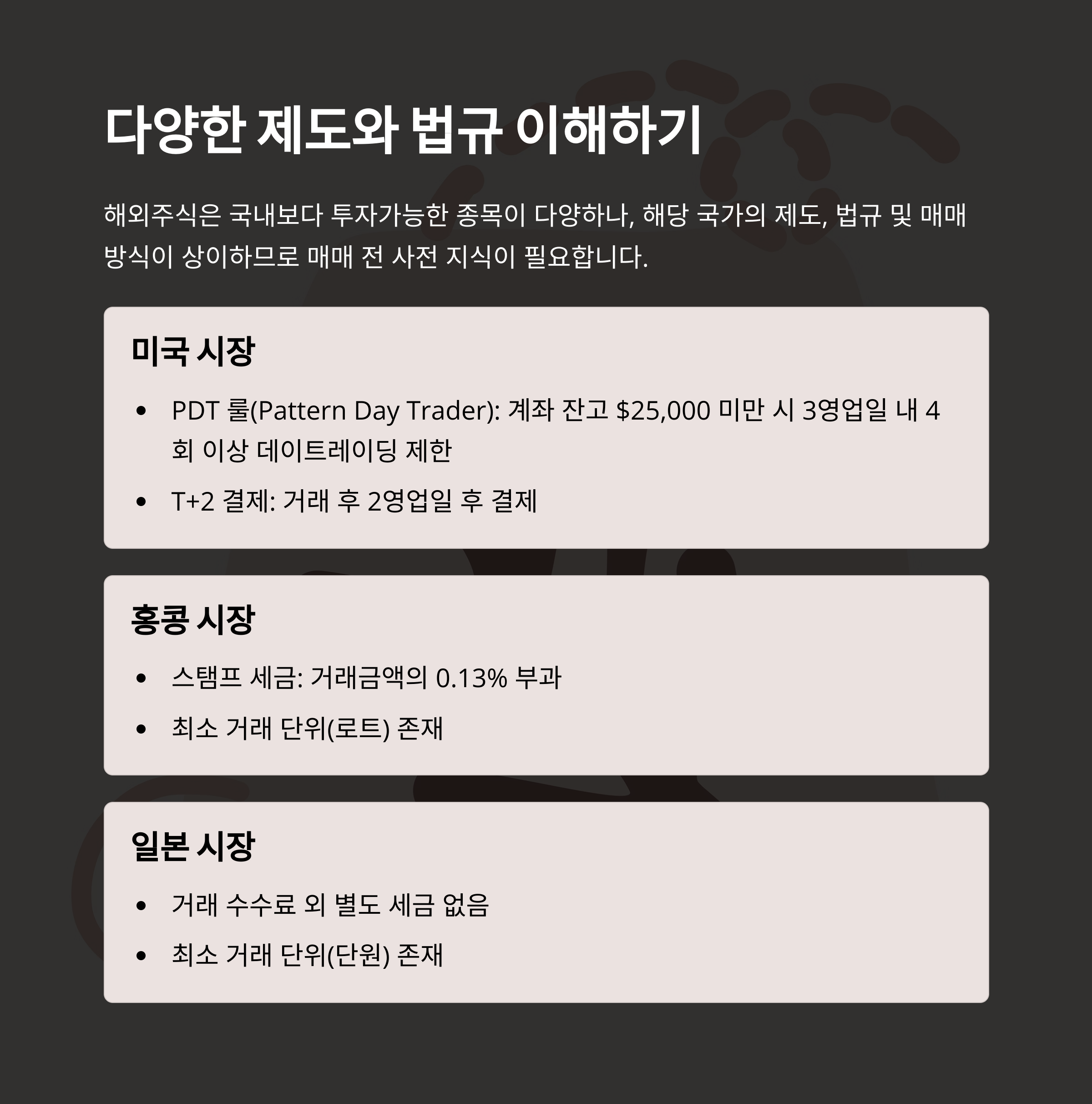 - 다양한 제도와 법규: 해외주식은 국내보다 투자가능한 종목이 다양하나, 해당 국가의 제도, 법규 및 매매방식이 상이하므로 매매 전 사전 지식이 필요합니다.