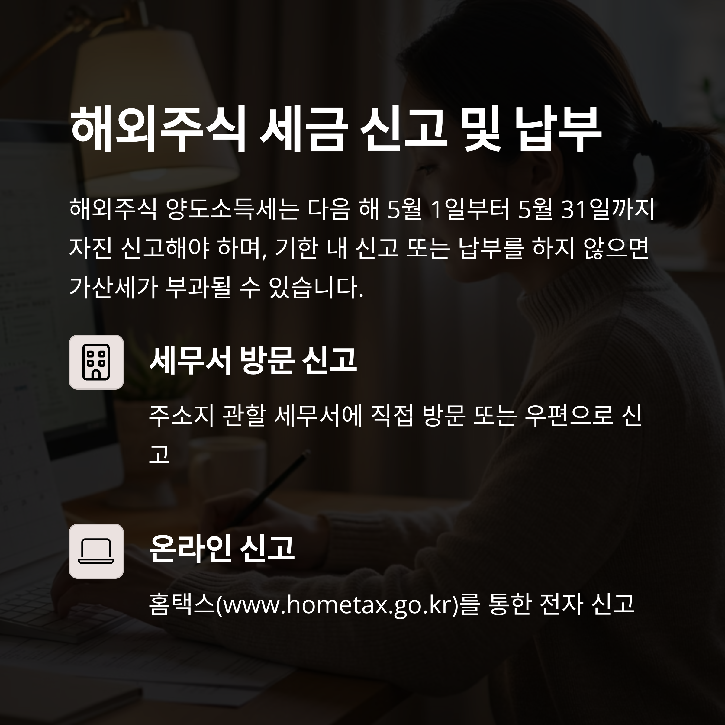 해외주식 양도소득세는 다음 해 5월 1일부터 5월 31일까지 자진 신고해야 하며, 기한 내 신고 또는 납부를 하지 않으면 가산세가 부과될 수 있습니다.