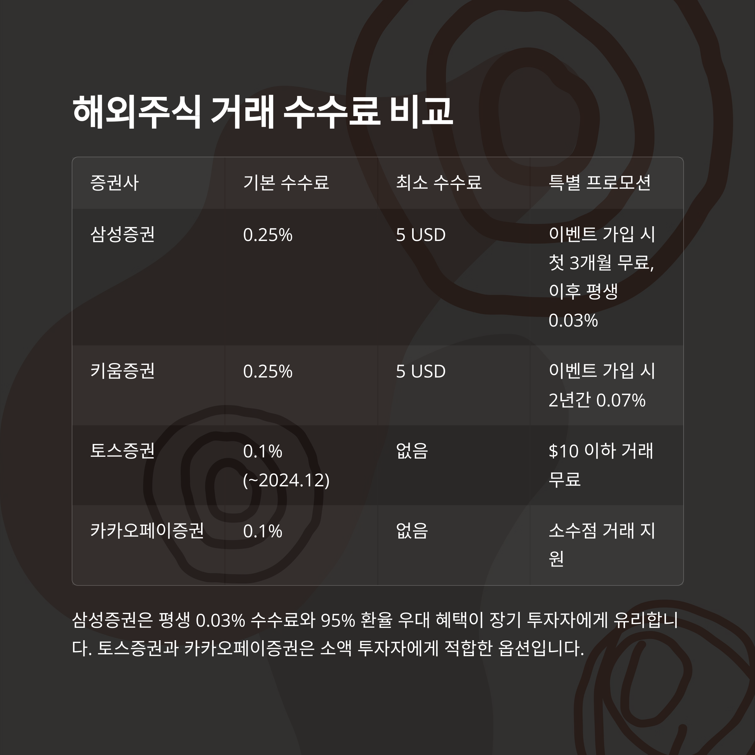 | 삼성증권 | 0.25% | 5 USD | 이벤트 가입 시 첫 3개월 무료, 이후 평생 0.03% |