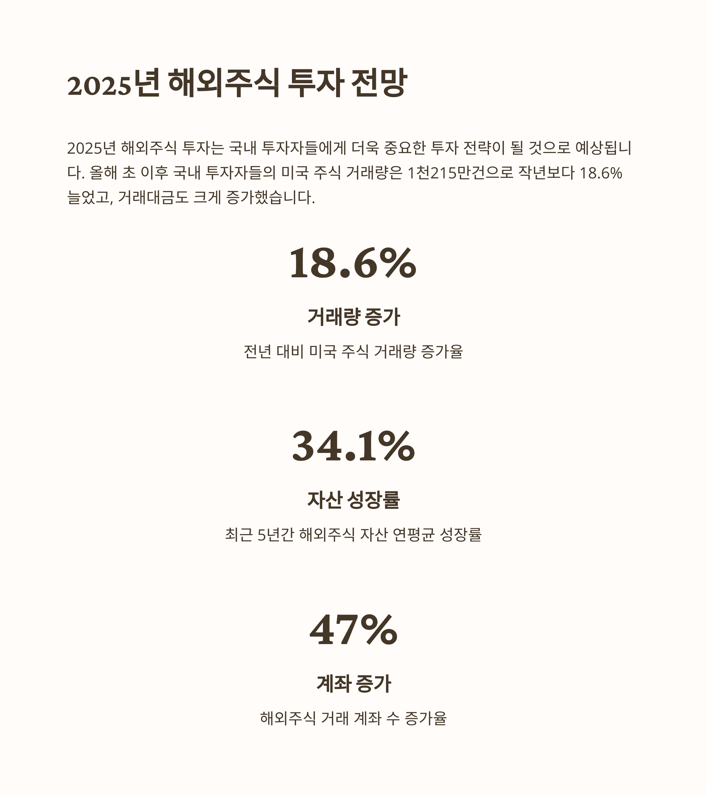 하지만 점차 경험이 쌓이면서 해외주식 투자가 생각보다 어렵지 않다는 것을 깨달았고, 오히려 투자 포트폴리오 다양화에 큰 도움이 된다는 것을 알게 되었습니다. 2025년 현재, 해외주식은 국내 투자자들 사이에서 가장 유망한 투자처로 꼽히고 있습니다.