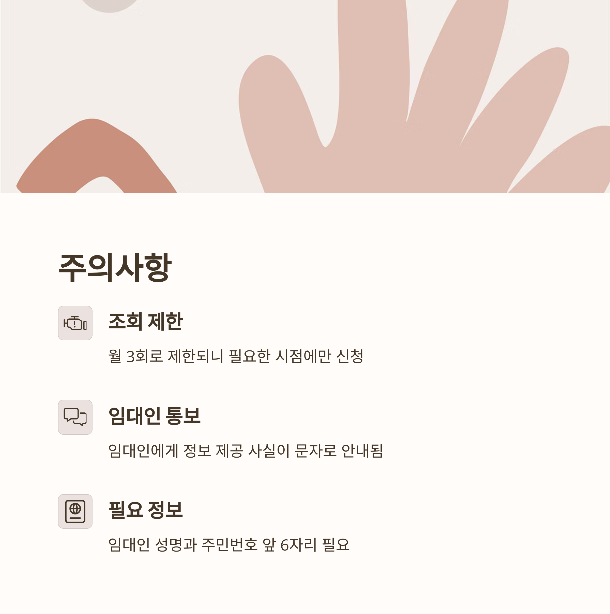 - 임대인에게 정보 제공 사실이 문자로 안내되므로, 허위 조회는 삼가세요.