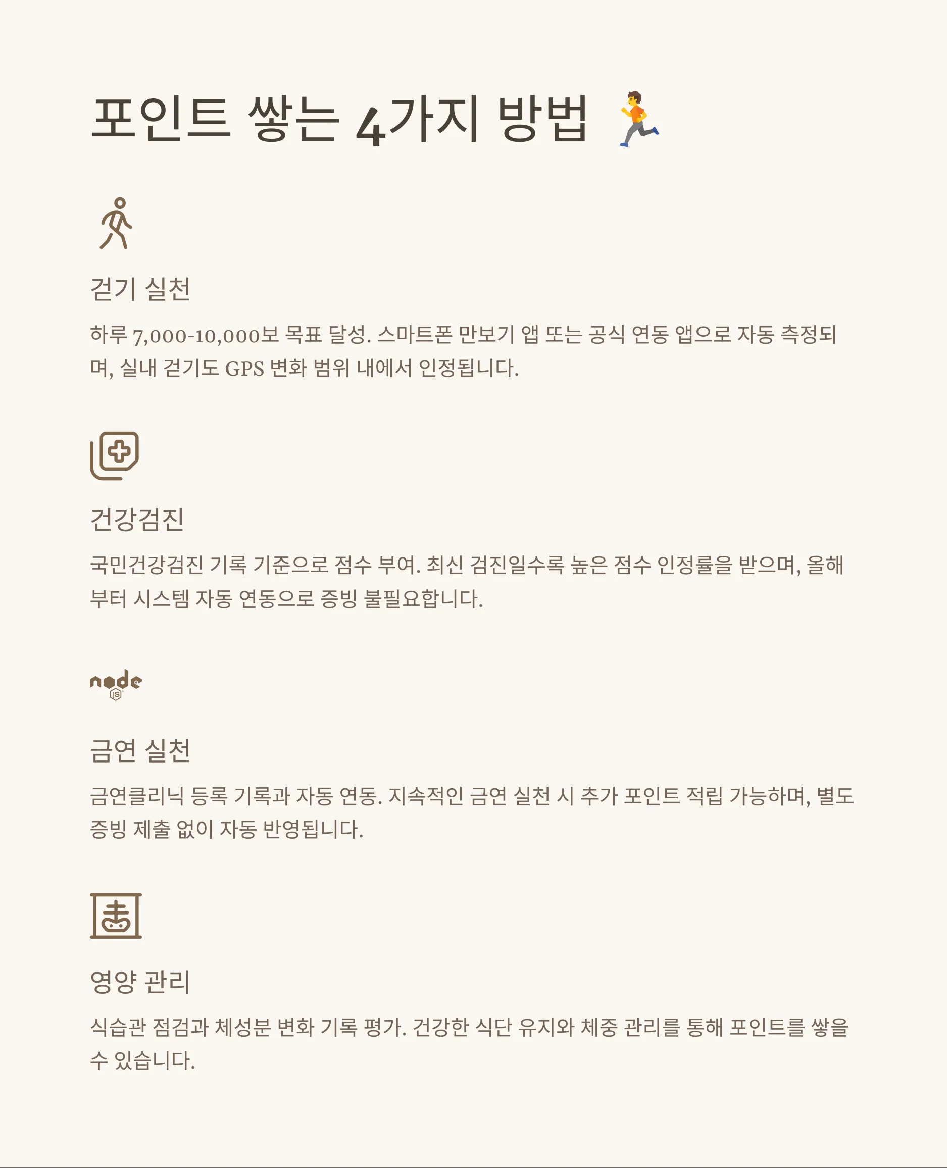 A: 포인트는 걷기, 건강검진, 금연 등의 활동을 통해 적립됩니다. 실천 항목에 따라 점수가 다르게 부여되며, 일정 기준을 충족하면 자동으로 적립됩니다.