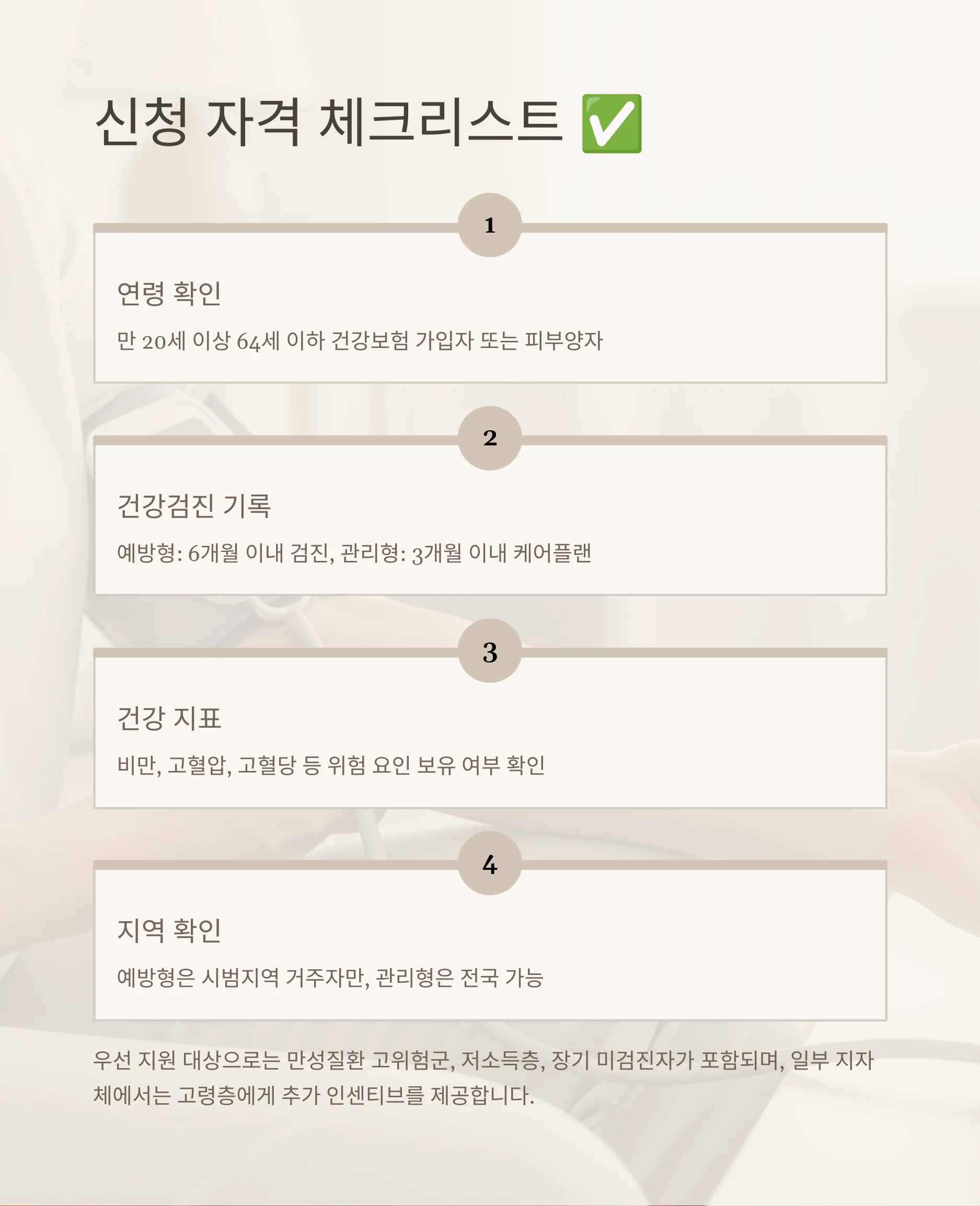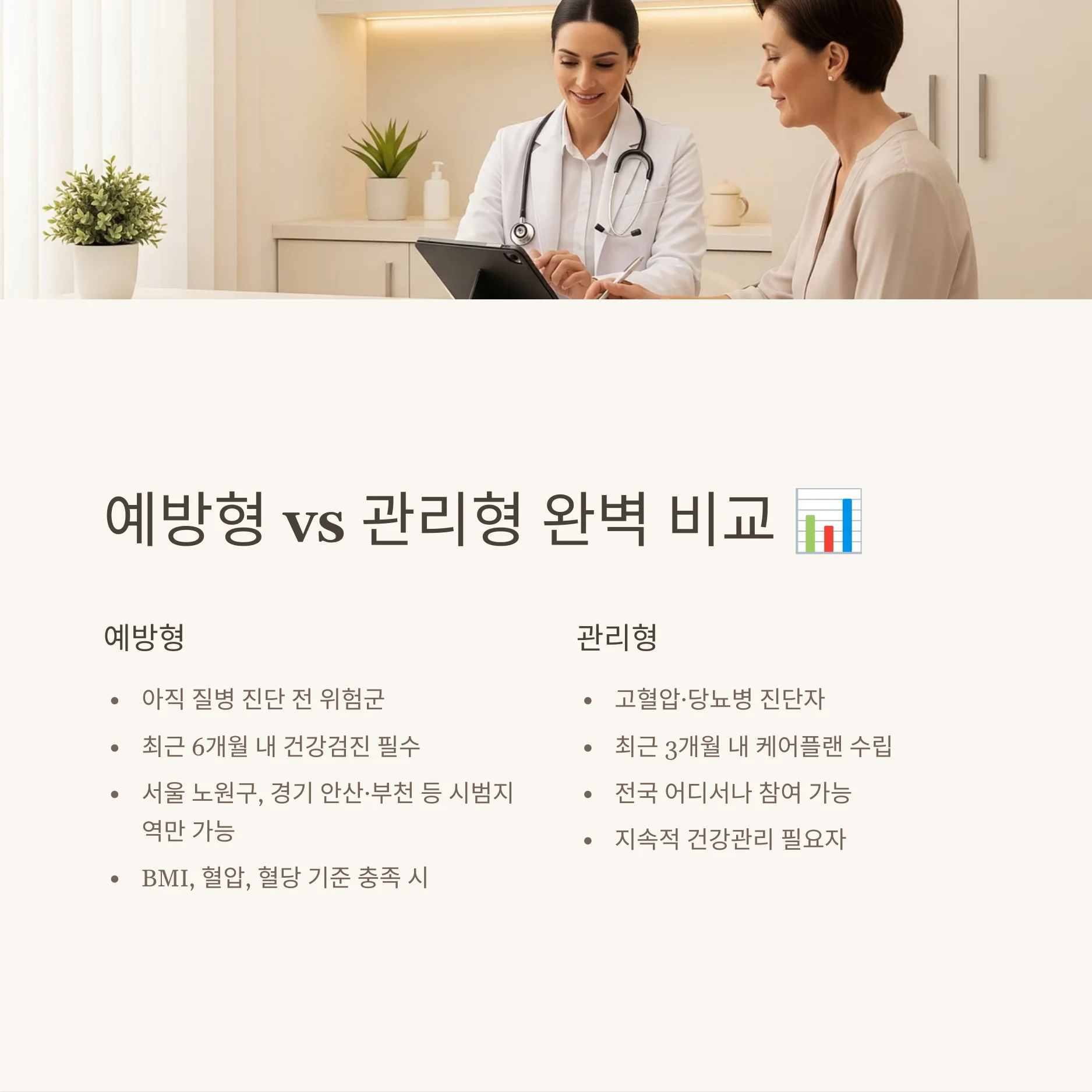 이 제도를 효과적으로 활용하기 위해서는 먼저 자신의 건강검진 결과를 확인하고, 해당 조건에 부합하는지 확인하는 것이 중요합니다. 예방형은 서울 노원구, 경기 안산·부천 등 일부 시범 지역에서만 신청 가능하므로, 거주지 확인도 필수입니다. 관리형은 전국적으로 참여 가능하나, 케어플랜이 수립된 고혈압·당뇨병 환자만 해당됩니다. 신청은 국민건강보험공단 홈페이지나 모바일 앱을 통해 간편하게 할 수 있으며, 신청 후에는 건강생활 실천 활동을 통해 포인트를 적립하게 됩니다.