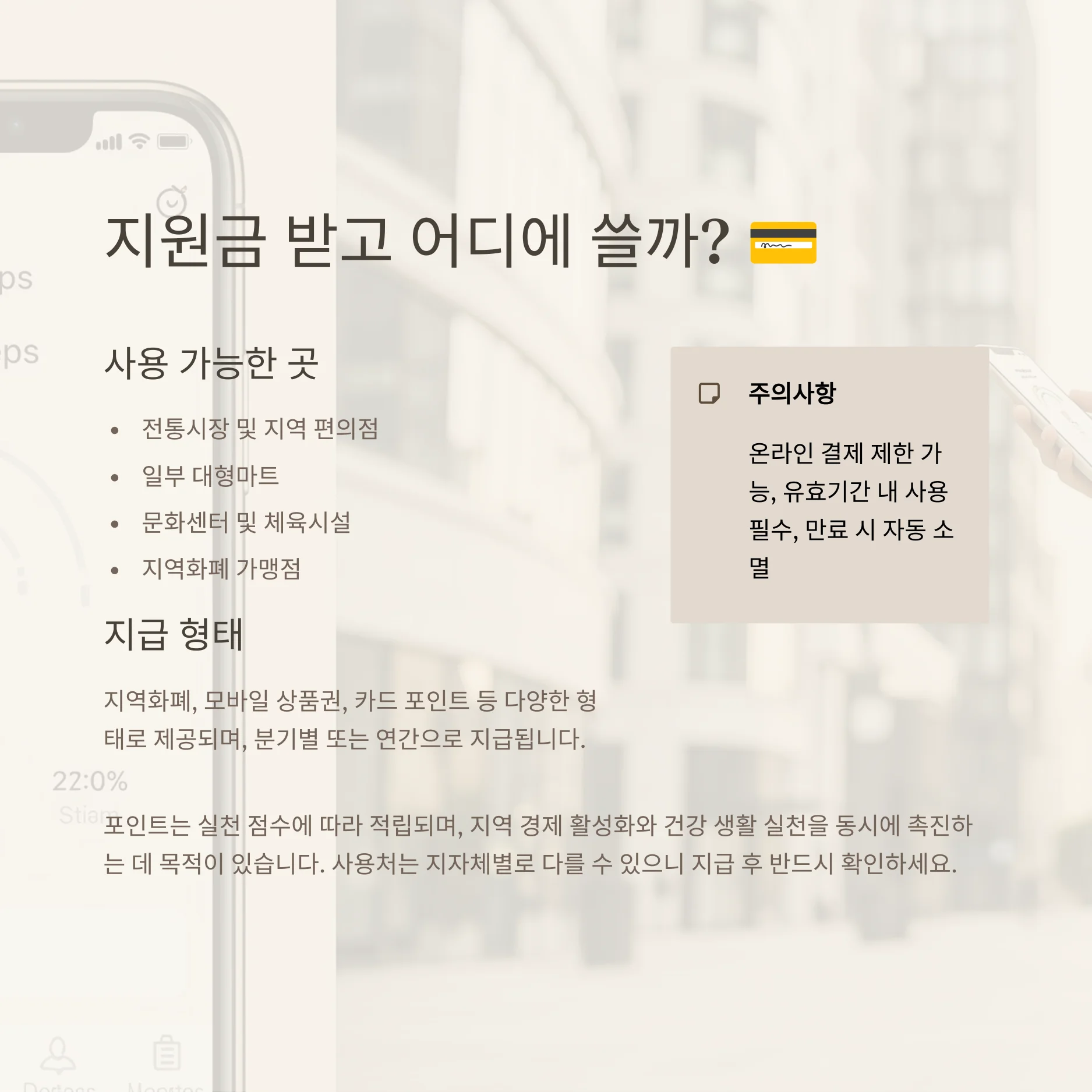 건강생활실천 지원금은 실천 점수에 따라 포인트 형태로 적립되며, 일정 기준을 충족하면 분기별 또는 연간으로 지급됩니다. 이 포인트는 지역화폐, 모바일 상품권, 카드 포인트 등 다양한 형태로 제공되며, 사용처는 주로 전통시장, 지역 편의점, 일부 대형마트, 문화센터, 체육시설 등으로 제한됩니다. 온라인 결제에서는 사용이 제한될 수 있으므로, 지급 후 사용 가능한 곳을 미리 확인하는 것이 중요합니다. 또한, 포인트나 상품권은 유효기간이 존재하며, 만료 시 자동 소멸될 수 있으므로 기간 내 사용하는 것이 필요합니다. 이러한 제도는 지역 경제 활성화와 건강 생활 실천을 동시에 촉진하는 데 목적이 있습니다.