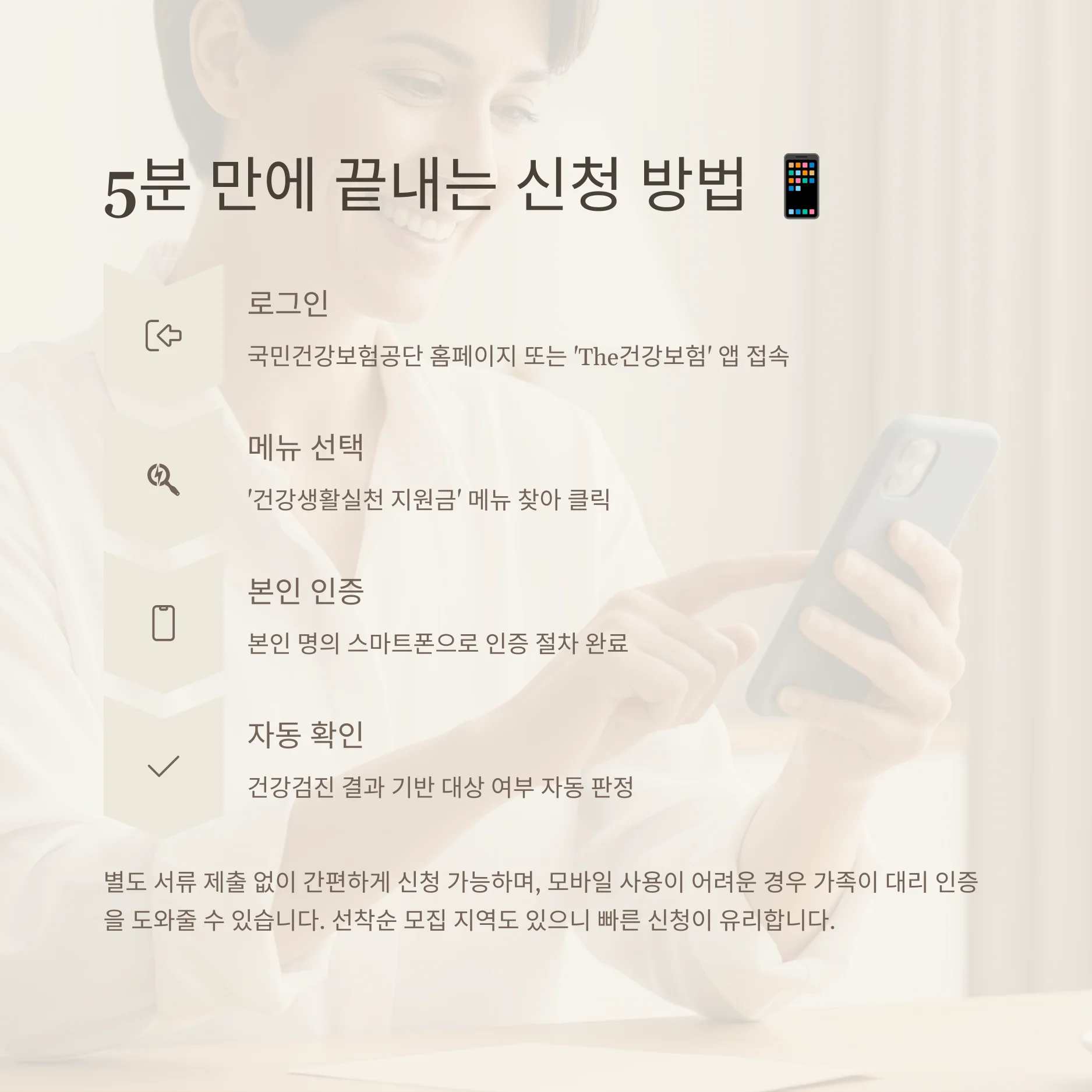 건강생활 실천 지원금을 신청할 때는 별도의 복잡한 서류가 필요하지 않지만, 몇 가지 주의사항을 염두에 두어야 합니다. 먼저, 신청자는 본인의 건강보험 정보와 최근 건강검진 결과를 확인해야 하며, 이는 자동으로 시스템에서 연동되어 대상 여부를 판단하는 데 사용됩니다. 예방형의 경우, 건강검진일로부터 6개월 이내에 신청해야 하므로 기한을 놓치지 않도록 주의해야 합니다. 관리형은 케어플랜 수립 후 12개월 이내에 신청해야 하며, 이 역시 기한을 넘기지 않도록 유의해야 합니다. 신청은 주로 온라인으로 진행되며, 국민건강보험공단 홈페이지나 'The건강보험' 앱을 통해 간편하게 할 수 있습니다. 신청 시 본인 인증이 필요하므로, 본인 명의의 스마트폰을 사용하여 인증 절차를 완료해야 합니다. 일부 지역에서는 선착순으로 참여자를 모집할 수 있으므로, 신청 초기 단계에서 빠르게 참여하는 것이 중요합니다. 이러한 사항들을 잘 숙지하고 준비하면 신청 과정이 원활하게 진행될 수 있습니다.