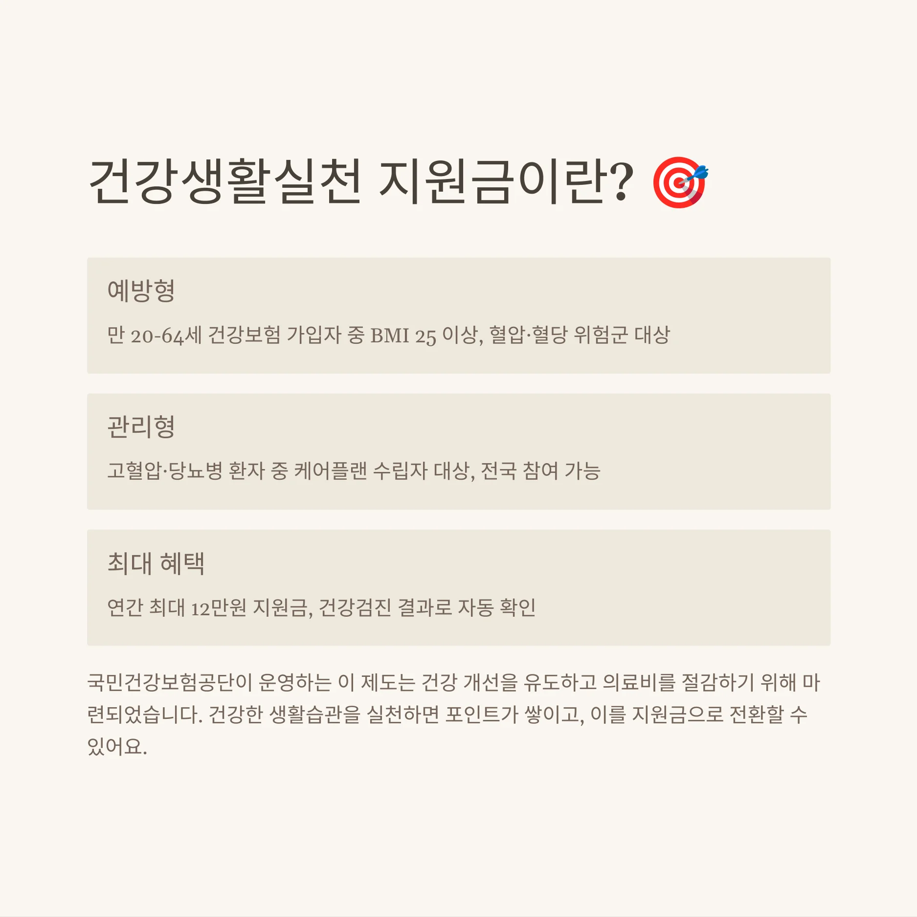 건강생활실천 지원금은 일상에서 건강을 챙기면서 동시에 경제적 혜택을 얻을 수 있는 매력적인 제도입니다. 2025년 기준, 이 제도는 국민건강보험공단이 운영하는 시범사업으로, 건강검진 결과에 따라 예방형과 관리형으로 나뉘어 지원금을 받을 수 있습니다. 예방형은 비만, 혈압, 혈당 등에서 위험 요인이 있는 사람들을 대상으로 하며, 관리형은 만성질환 진단을 받은 사람들을 위한 것입니다. 이 제도를 통해 연 최대 12만 원까지 지원받을 수 있으며, 참여는 건강검진 결과에 따라 자동으로 확인됩니다.