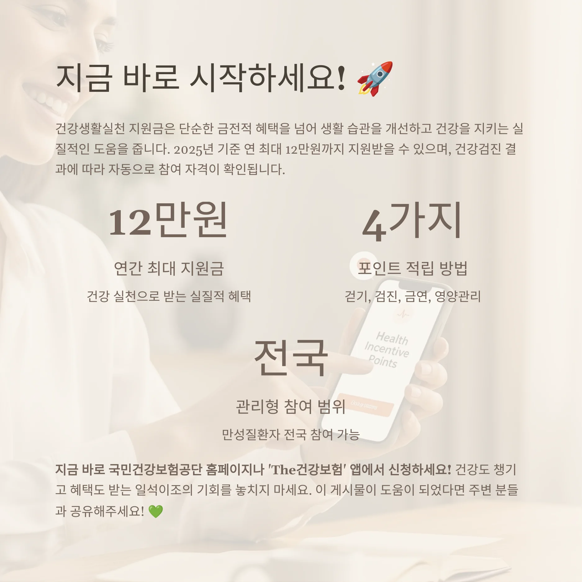 안녕하세요, 건강을 위해 실천하는 것만으로도 12만원의 혜택을 받을 수 있는 '건강생활 실천 지원금'에 대해 알아볼까요? 함께 건강한 삶을 누리며 혜택도 받아보세요!