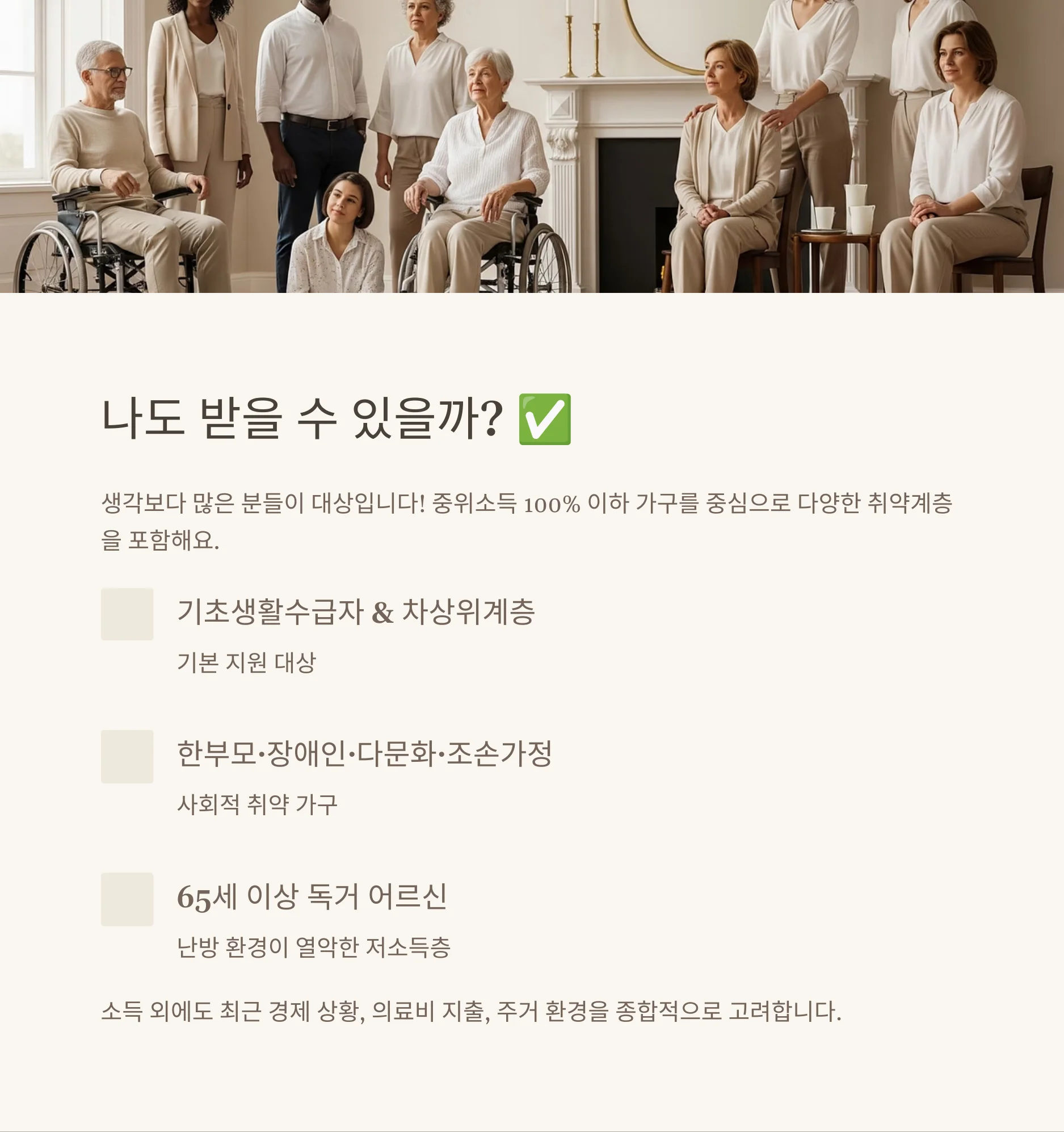 난방비 지원금은 주로 에너지 취약계층을 대상으로 하여 경제적 부담을 덜어주는 데 목적이 있습니다. 지원 대상은 기초생활수급자와 차상위계층이 기본이며, 여기에 한부모가정, 장애인 가구, 다문화 가정, 조손가정 등 사회적으로 취약한 가구도 포함됩니다. 특히 65세 이상 독거 어르신 가구나 난방 환경이 열악한 저소득층 가구도 심사 대상에 오릅니다. 소득 기준으로는 대략 중위소득 100% 이하의 가구를 중심으로 하며, 심사 시에는 소득 외에도 최근의 경제 상황, 의료비 지출, 주거 환경 등을 종합적으로 고려합니다. 이러한 포용적인 기준은 다양한 사회적 약자를 지원하기 위한 것이며, 신청자는 자신의 상황에 맞는 지원 자격을 충분히 검토한 후 신청할 수 있습니다. 난방비 지원금은 실제 생활에 실질적인 도움이 되도록 설계되어 있으며, 지원 대상에 해당하는 가구는 신청을 통해 겨울철 난방비 부담을 줄일 수 있습니다.