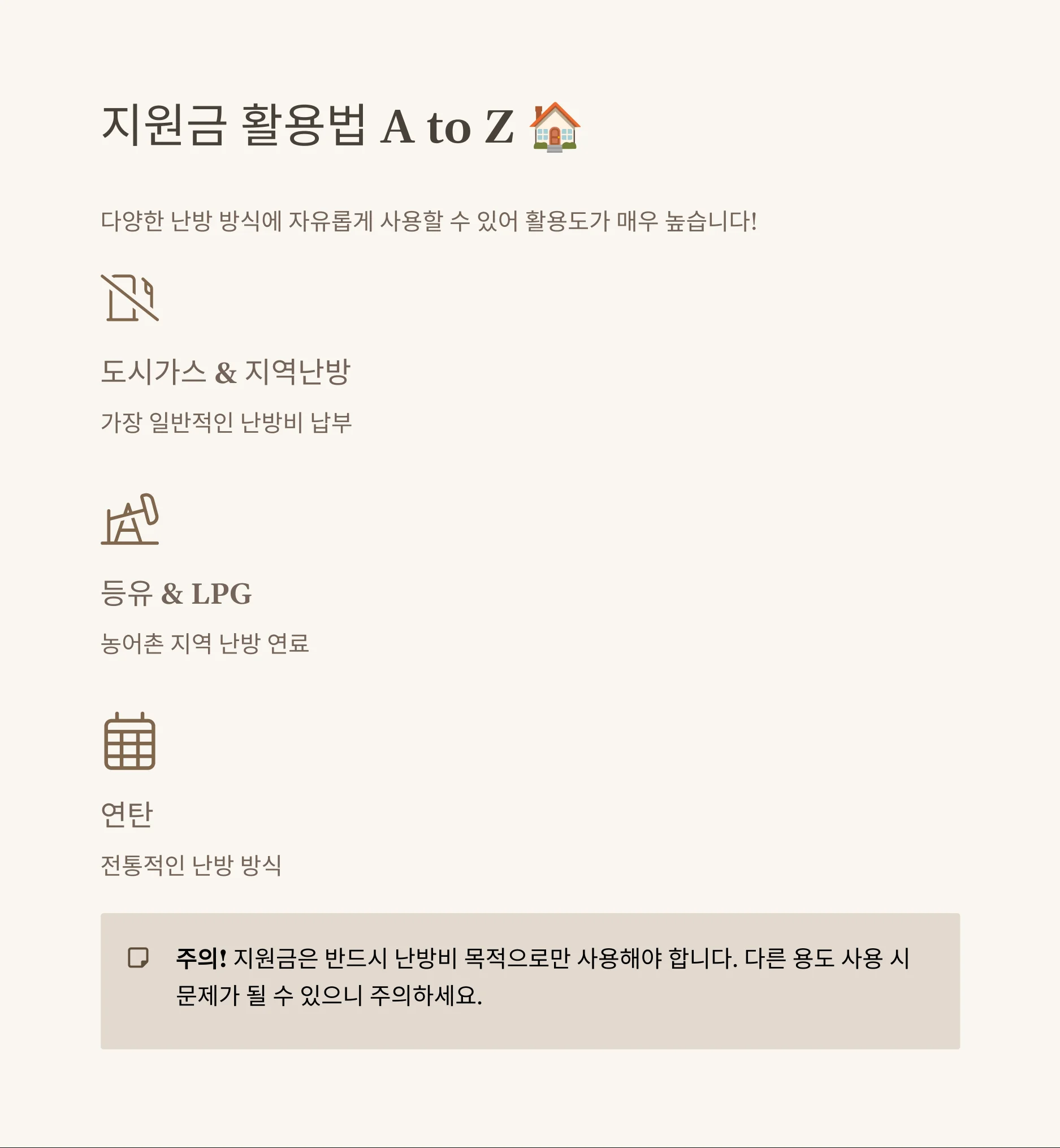 난방비 지원금은 다양한 난방 에너지를 구입하는 데 사용할 수 있어 활용도가 높습니다. 도시가스, 지역난방, 연탄, 등유, LPG 등 여러 형태의 난방비로 사용할 수 있어, 각 가정의 난방 방식에 맞춰 유연하게 활용 가능합니다. 그러나 지원금을 사용할 때 주의해야 할 점도 있습니다. 지원금은 반드시 난방비 목적으로 사용해야 하며, 다른 용도로 사용 시 문제가 될 수 있습니다. 또한, 지원금 신청 시 제공한 정보가 사실과 다를 경우, 지원금이 환수될 수 있으므로 정확한 정보를 제공하는 것이 중요합니다. 이러한 점을 유념하여 난방비 지원금을 적절히 활용하면, 겨울철 난방비 부담을 효과적으로 줄일 수 있습니다.