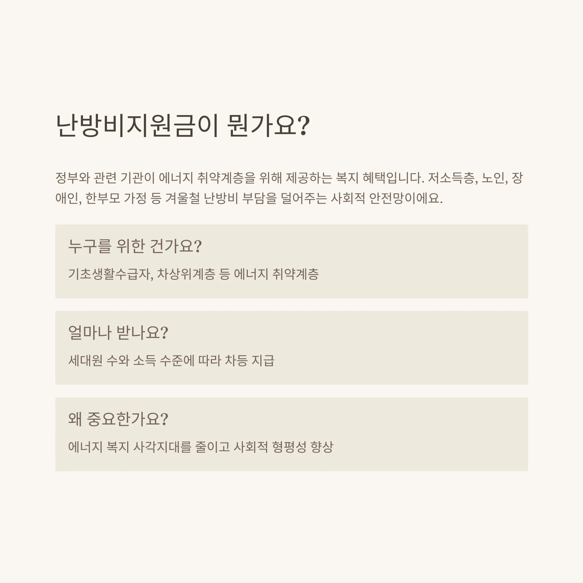 난방비 지원금은 에너지 비용 부담을 줄이기 위해 정부와 관련 기관이 제공하는 복지 혜택입니다. 특히 저소득층, 노인, 장애인, 한부모 가정 등 에너지 취약계층을 대상으로 하여 겨울철 난방비를 지원함으로써 경제적 부담을 덜어주고 있습니다. 이러한 지원금은 단순한 금전적 지원을 넘어, 사회적 안전망을 강화하고 모든 계층이 따뜻한 겨울을 보낼 수 있도록 돕는 데 그 목적이 있습니다. 난방비 지원금은 주로 에너지바우처 제도를 통해 제공되며, 지원 대상은 기초생활수급자 및 차상위계층을 포함한 다양한 사회적 취약 계층으로 확대되고 있습니다. 지원 금액은 세대원 수와 소득 수준에 따라 차등 지급되며, 이는 실제 생활비 절감에 큰 도움이 됩니다. 난방비 지원금은 단순한 재정 지원을 넘어, 에너지 복지의 사각지대를 줄이고, 사회적 형평성을 높이는 데 기여하고 있습니다. 이러한 정책은 에너지 비용이 급등하는 상황에서 더욱 중요한 의미를 가지며, 많은 가정이 경제적 어려움 속에서도 따뜻한 겨울을 보낼 수 있도록 실질적인 도움을 제공합니다.