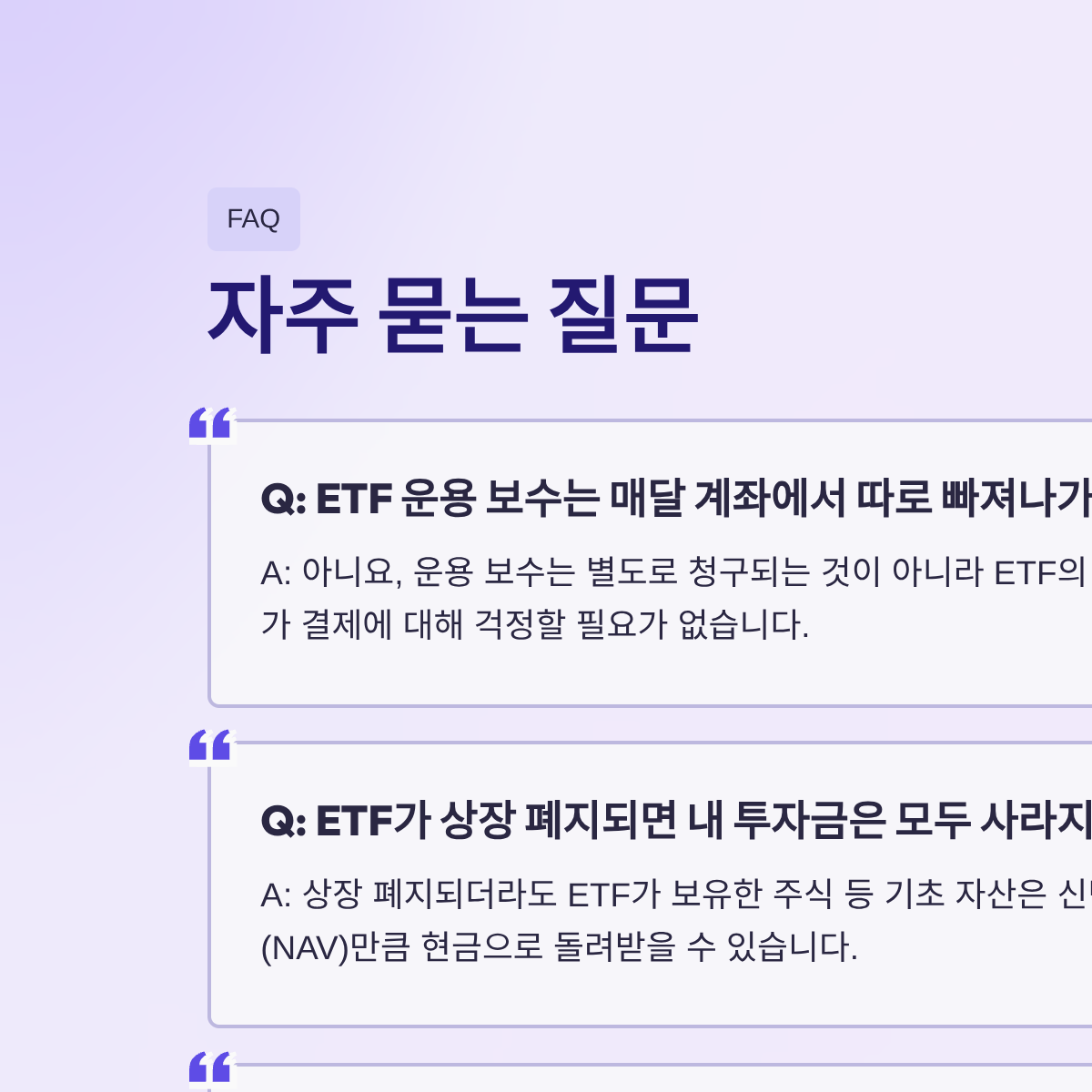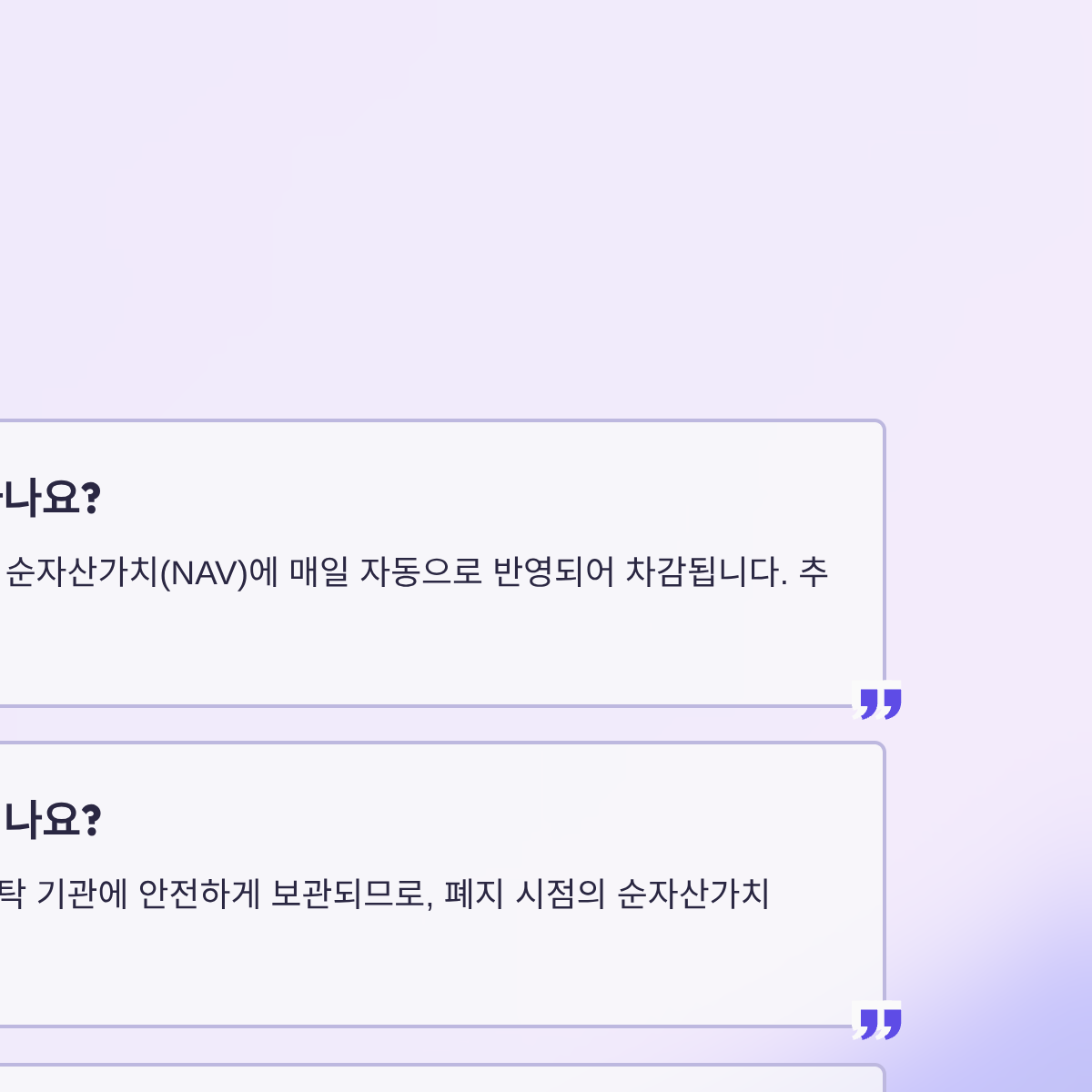 A: 아니요, 운용 보수는 별도로 청구되는 것이 아니라 ETF의 순자산가치(NAV)에 매일 자동으로 반영되어 차감됩니다. 따라서 투자자가 MTS에서 확인하는 현재가는 이미 보수가 제외된 가격이므로 추가 결제에 대해 걱정할 필요가 없습니다.