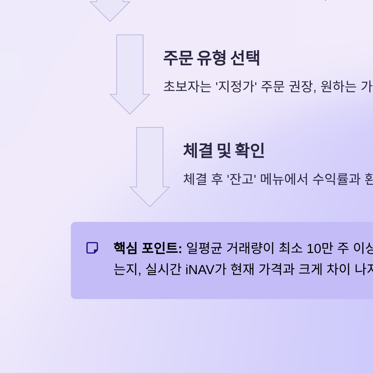 - [ ] 거래량 확인: 일평균 거래량이 최소 10만 주 이상인가? (괴리율 발생 방지)