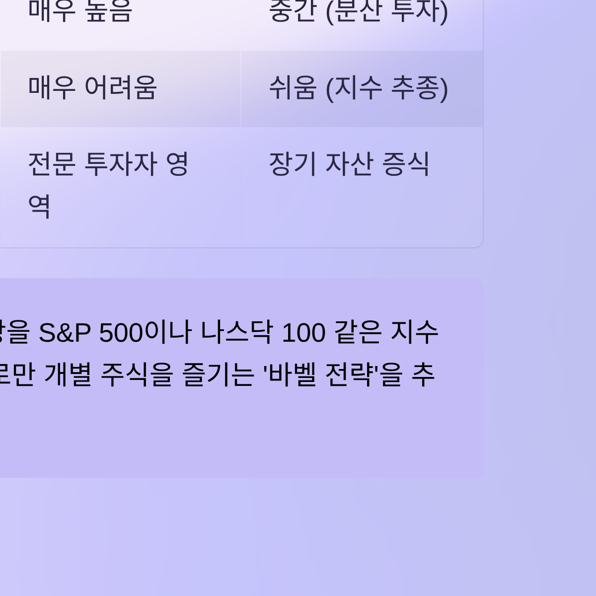 | 관리 난이도 | 매우 쉬움 | 매우 어려움 (분석 필요) | 쉬움 (지수 추종) | 투자에 소요되는 시간 |