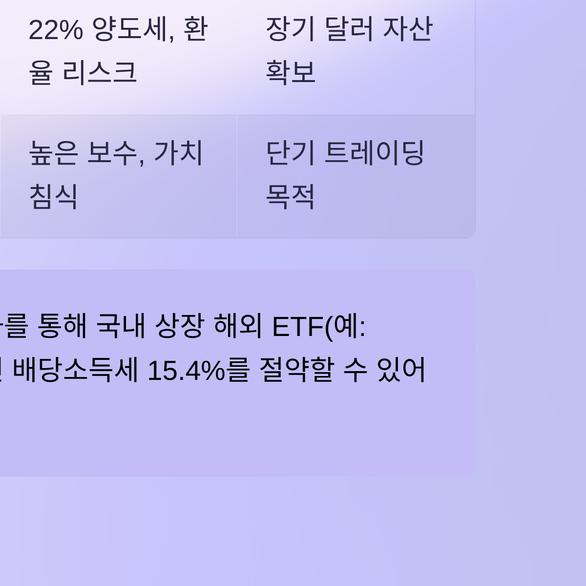 | 미국 직구 ETF | 낮은 보수, 달러 자산 보유 | 22% 양도소득세, 환율 변동 리스크 | 장기 달러 자산 확보 |