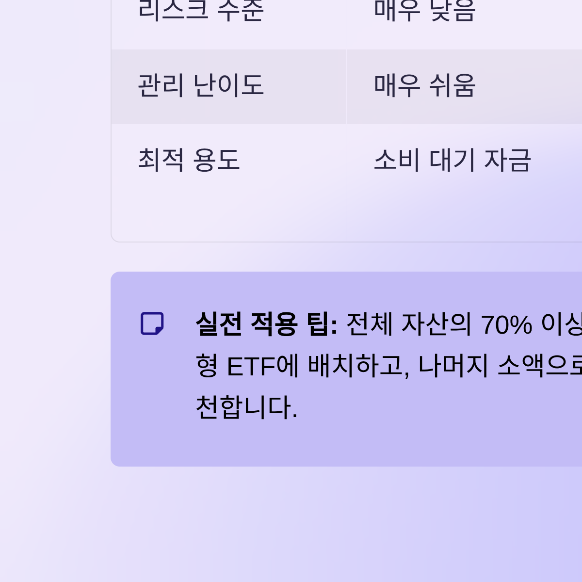 | 한눈에 보는 결론 | 소비 대기 자금용 | 전문 투자자 영역 | 장기 자산 증식 최적 | 자산 배분의 핵심 |