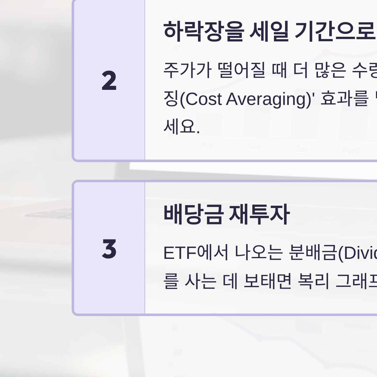 * 배당금 재투자: ETF에서 나오는 분배금(Dividend)을 인출하지 않고 다시 해당 ETF를 사는 데 보태면 복리 그래프의 기울기가 급격히 가팔라집니다.