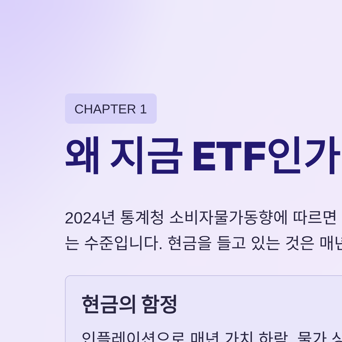 통계청의 2025년 소비자물가동향에 따르면 물가 상승률은 여전히 자산 가치를 위협하는 수준입니다. 현금을 들고 있는 것은 매년 그만큼의 구매력을 잃는 것과 같습니다. 개별 주식은 높은 수익을 기대할 수 있지만 특정 기업의 악재(예: 횡령, 부도)에 취약합니다. 반면 ETF(상장지수펀드, Exchange Traded Fund)는 수십, 수백 개의 기업에 분산 투자하여 '상장 폐지'의 위험을 원천적으로 차단하면서도 시장 성장의 과실을 누릴 수 있게 해줍니다.
