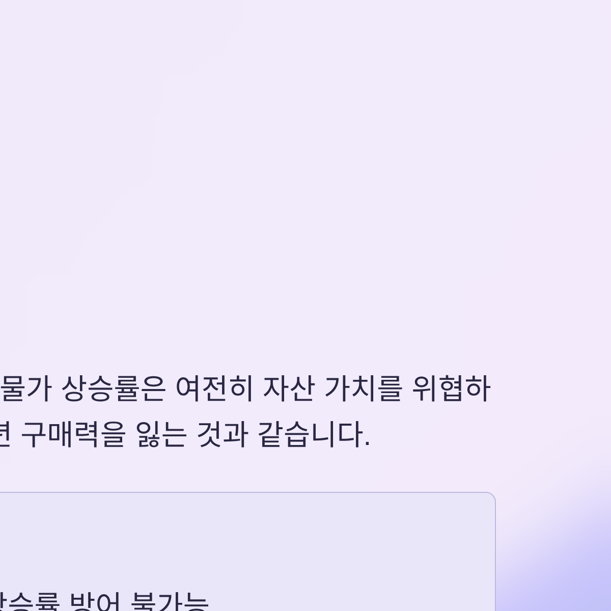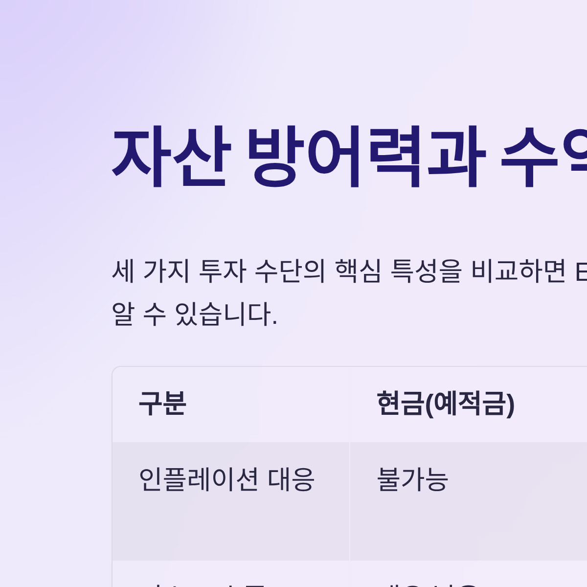 | 인플레이션 대응 | 불가능 (가치 하락) | 가능 (높은 변동성) | 우수 (시장 평균 추종) | 물가 상승률 방어 여부 |