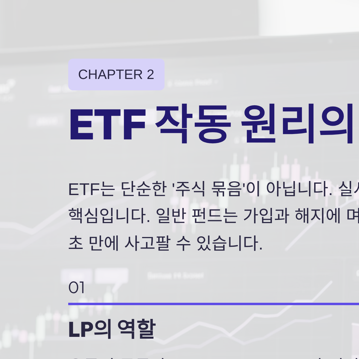 많은 분이 ETF를 단순히 '주식 묶음'으로만 알고 계시지만, 핵심은 실시간 거래가 가능한 '인덱스 펀드'라는 점입니다. 일반 펀드는 가입과 해지에 며칠이 소요되지만, ETF는 주식 시장에서 1초 만에 사고팔 수 있습니다. 이는 LP(유동성 공급자, Liquidity Provider)라는 기관이 적정 가격에 매수/매도 호가를 계속 대주기 때문에 가능합니다. 또한 순자산가치(NAV, Net Asset Value)라는 기준점이 있어, 내가 사는 가격이 실제 가치보다 비싼지 싼지(괴리율)를 즉시 확인할 수 있습니다.