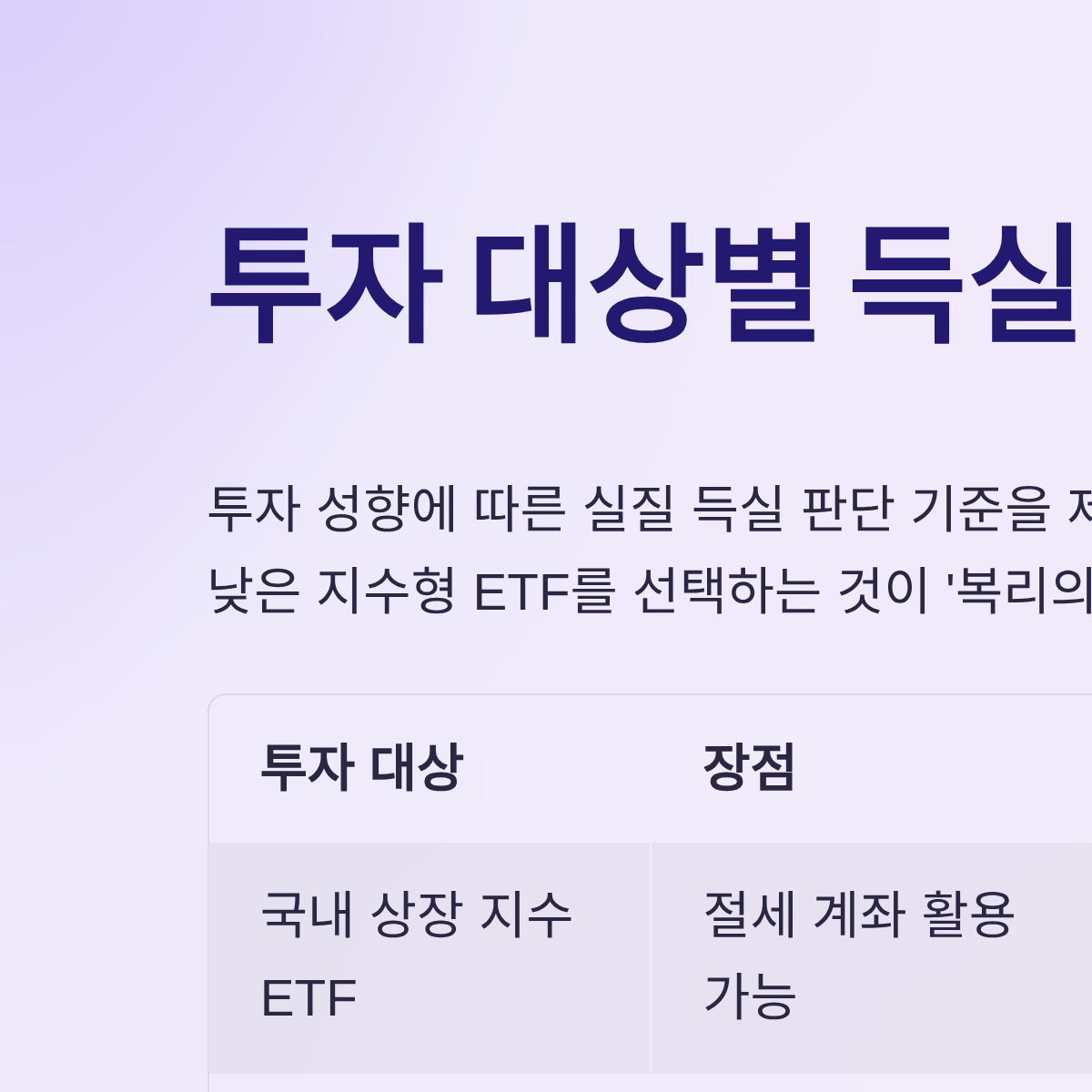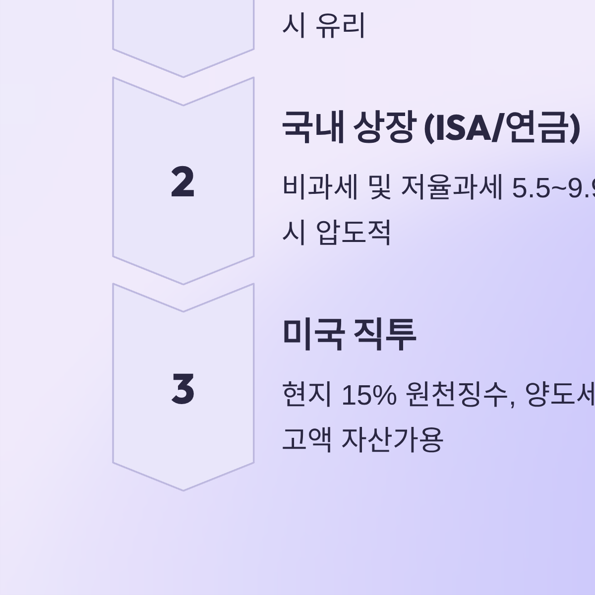 | 국내 상장 지수 ETF | 절세 계좌(ISA, 연금) 활용 가능 | 해외 직구 대비 높은 보수 가능성 | 세금 혜택 극대화 |