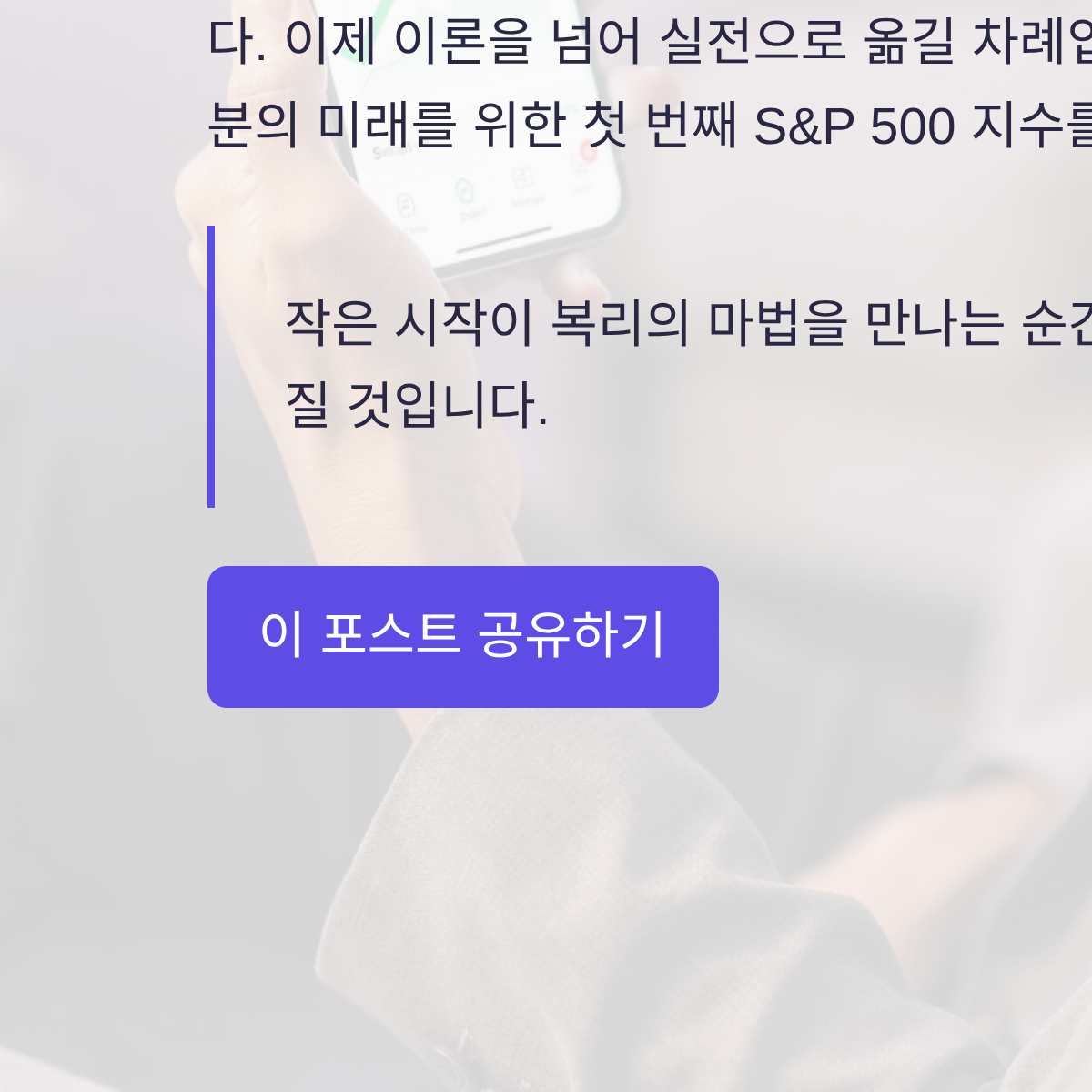 시중의 일반적인 정보들이 '무엇을 살까'에만 집중할 때, 여러분은 '어떻게 비용을 줄이고 수익을 지킬 것인가'라는 한 단계 높은 전략을 습득하셨습니다. 남들보다 앞서가는 투자자는 수익률뿐만 아니라 '비용'과 '세금'에서 차이를 만듭니다. 이제 이론을 넘어 실전으로 옮길 차례입니다. 오늘 바로 증권사 앱을 켜고, 여러분의 미래를 위한 첫 번째 S&P 500 지수를 장바구니에 담아보세요. 작은 시작이 복리의 마법을 만나는 순간, 경제적 자유로 향하는 길은 더욱 선명해질 것입니다.