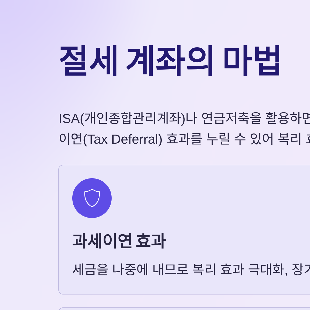 * 절세 계좌의 마법: ISA(개인종합관리계좌)나 연금저축을 활용하면 매매차익에 대해 당장 세금을 내지 않는 과세이연(Tax Deferral) 효과를 누릴 수 있어 복리 효과가 극대화됩니다.
