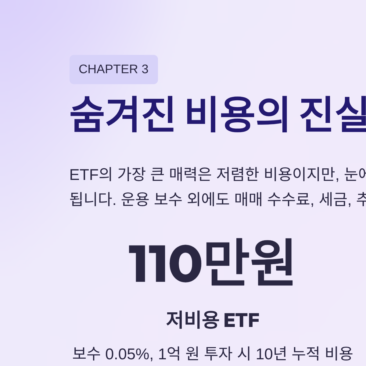 * 저비용 ETF (보수 0.05%): 누적 비용 약 110만 원 → 최종 자산 약 1.95억 원