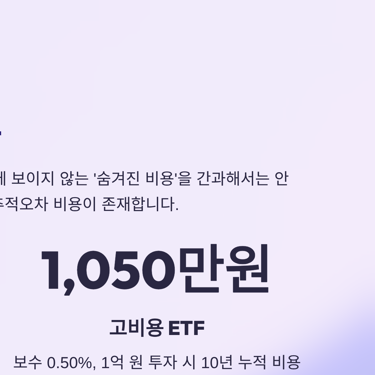 * 고비용 ETF (보수 0.50%): 누적 비용 약 1,050만 원 → 최종 자산 약 1.86억 원