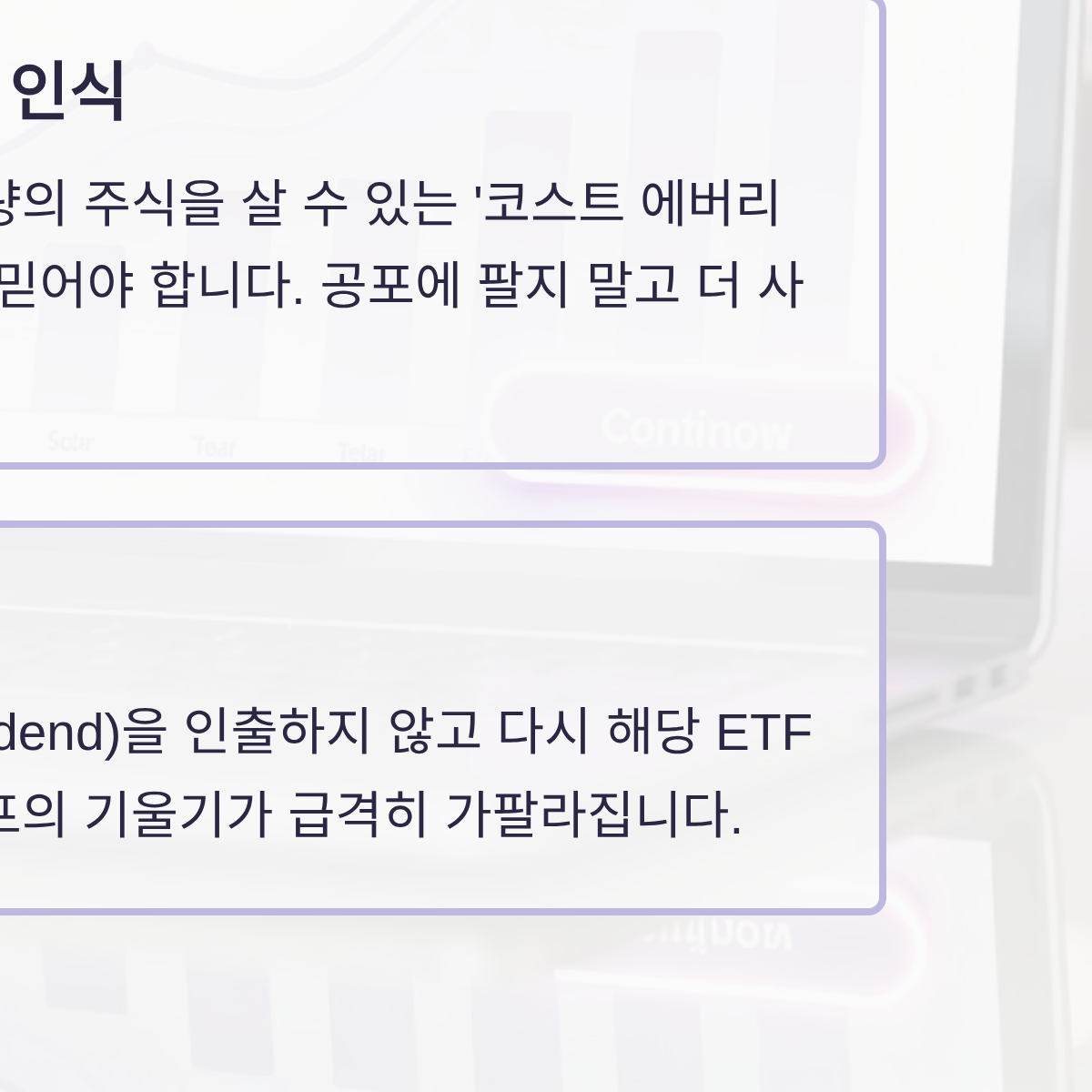 * 하락장을 세일 기간으로 인식: 주가가 떨어질 때 더 많은 수량의 주식을 살 수 있는 '코스트 에버리징(Cost Averaging)' 효과를 믿어야 합니다.