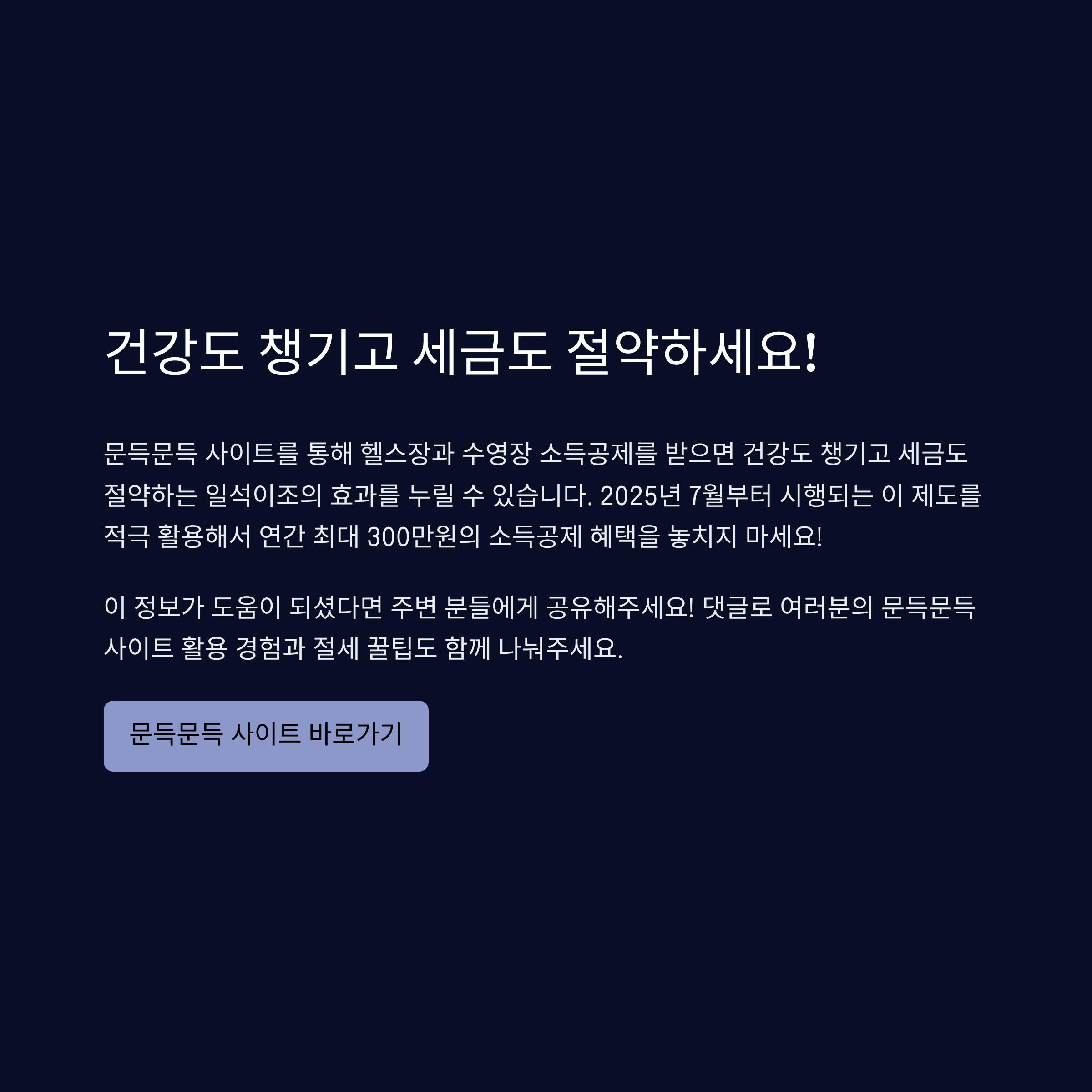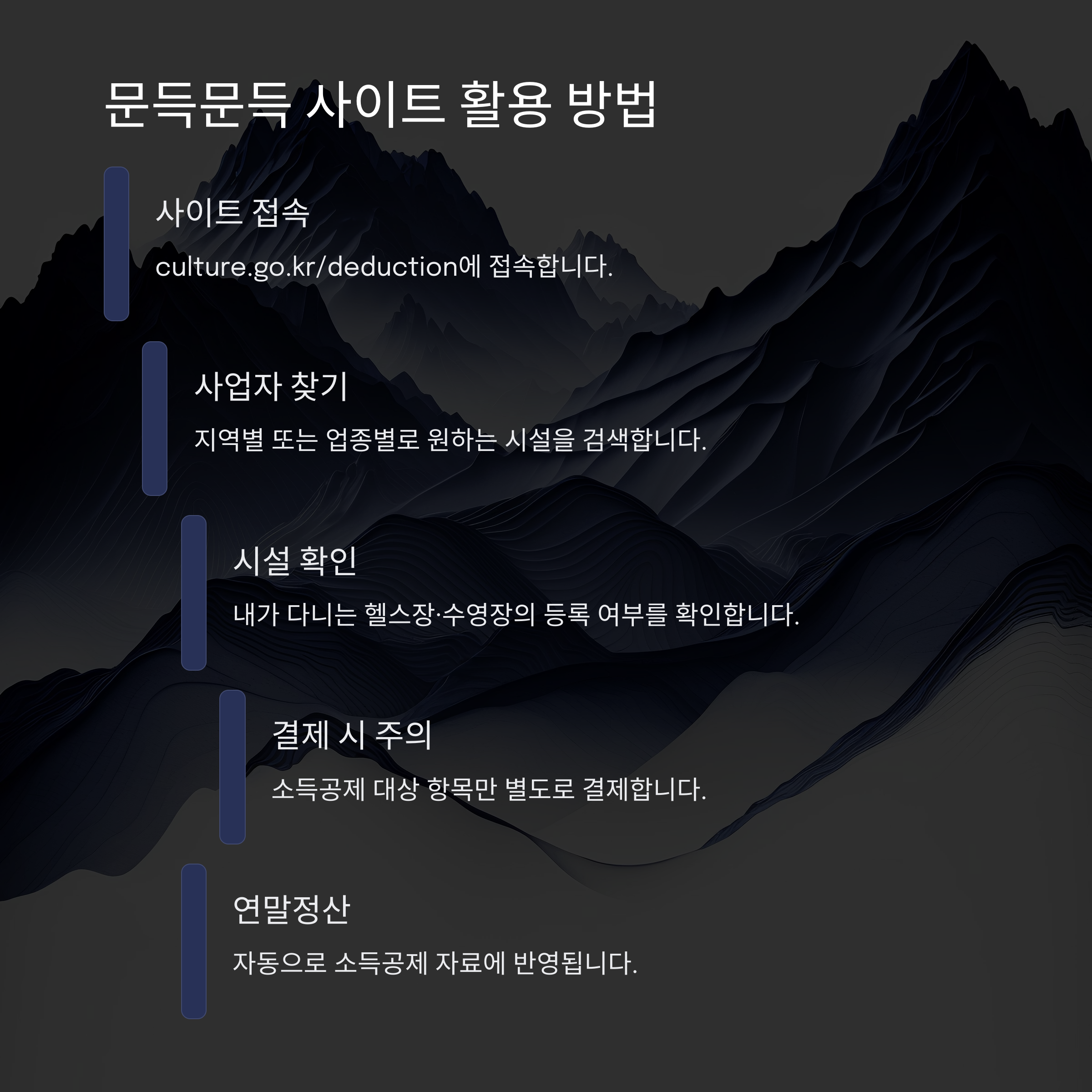 문득문득 사이트를 통해 헬스장과 수영장 소득공제를 받으면 건강도 챙기고 세금도 절약하는 일석이조의 효과를 누릴 수 있습니다. 2025년 7월부터 시행되는 이 제도를 적극 활용해서 연간 최대 300만원의 소득공제 혜택을 놓치지 마세요!