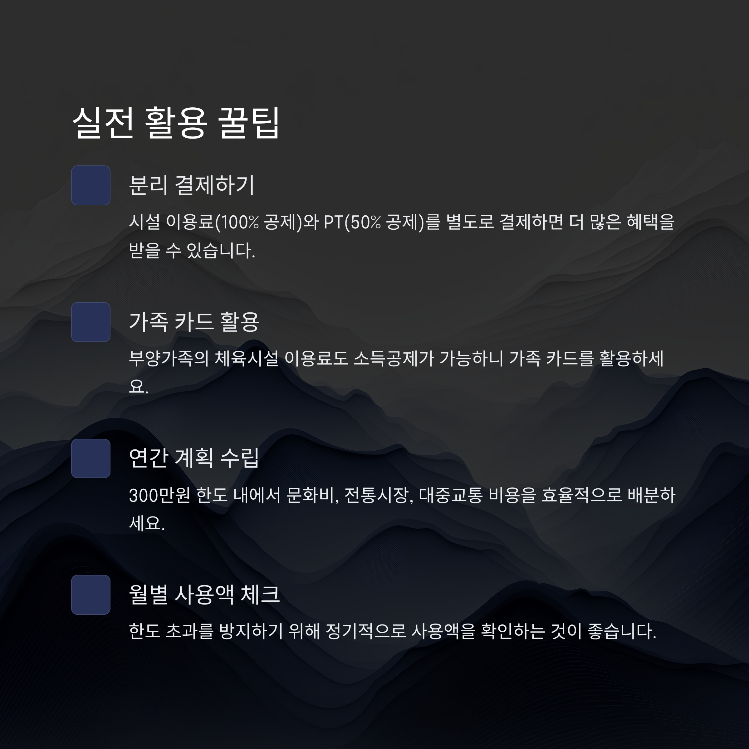 - 가족 카드 활용: 부양가족의 체육시설 이용료도 소득공제 가능