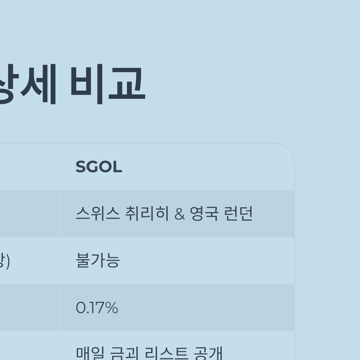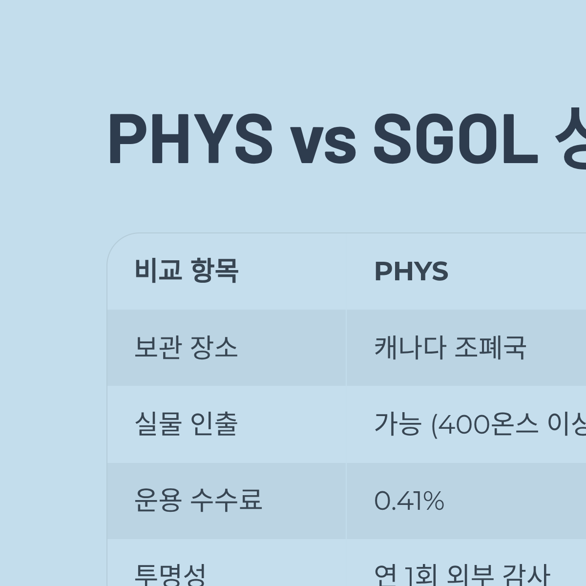 | 비교 항목 | PHYS (Sprott Physical Gold) | SGOL (abrdn Physical Gold) | 핵심 판단 기준 |