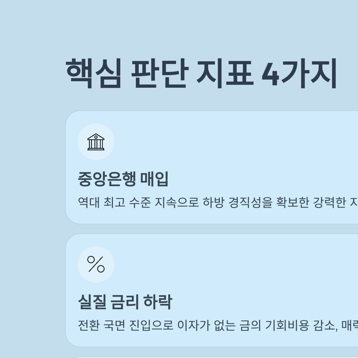 | 중앙은행 매입 | 역대 최고 수준 지속 | 하방 경직성을 확보한 강력한 지지선 형성 |