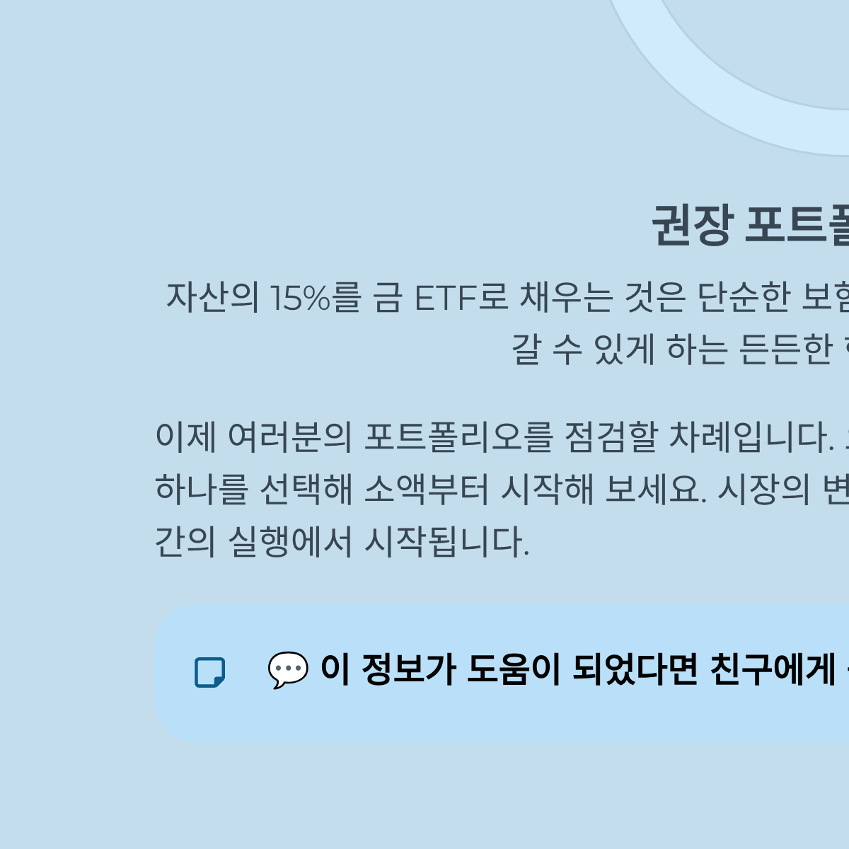 이제 여러분의 포트폴리오를 점검할 차례입니다. 자산의 15%를 금 ETF로 채우는 것은 단순한 보험이 아니라, 위기 상황에서 공격적인 투자를 이어갈 수 있게 하는 든든한 현금 흐름의 원천이 됩니다. 오늘 배운 티커 중 자신의 성향에 가장 부합하는 하나를 선택해 소액부터 시작해 보세요. 시장의 변동성을 수익의 기회로 바꾸는 여정은 지금 이 순간의 실행에서 시작됩니다.