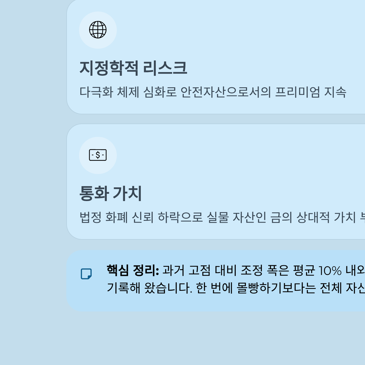 | 지정학적 리스크 | 다극화 체제 심화 | 안전자산(Safe Haven)으로서의 프리미엄 지속 |