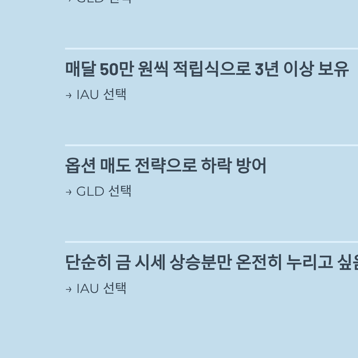 - [ ] 단순히 금 시세 상승분만 온전히 누리고 싶은가? → IAU