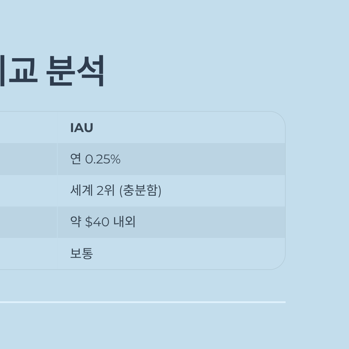 | 비교 항목 | GLD (SPDR Gold Shares) | IAU (iShares Gold Trust) | 핵심 판단 기준 |