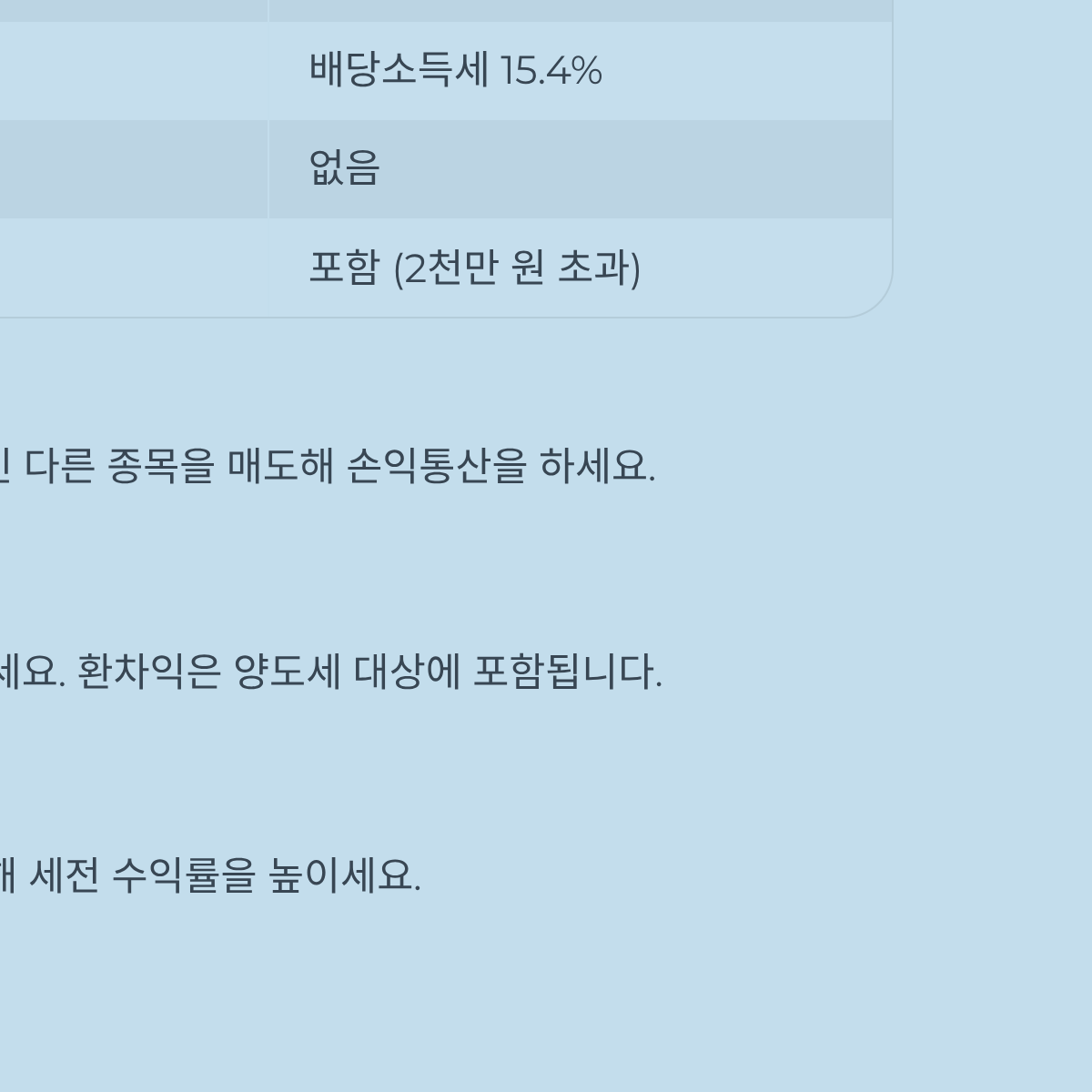 | 세금 종류 | 양도소득세 22% | 배당소득세 15.4% | 과세 체계의 차이 |