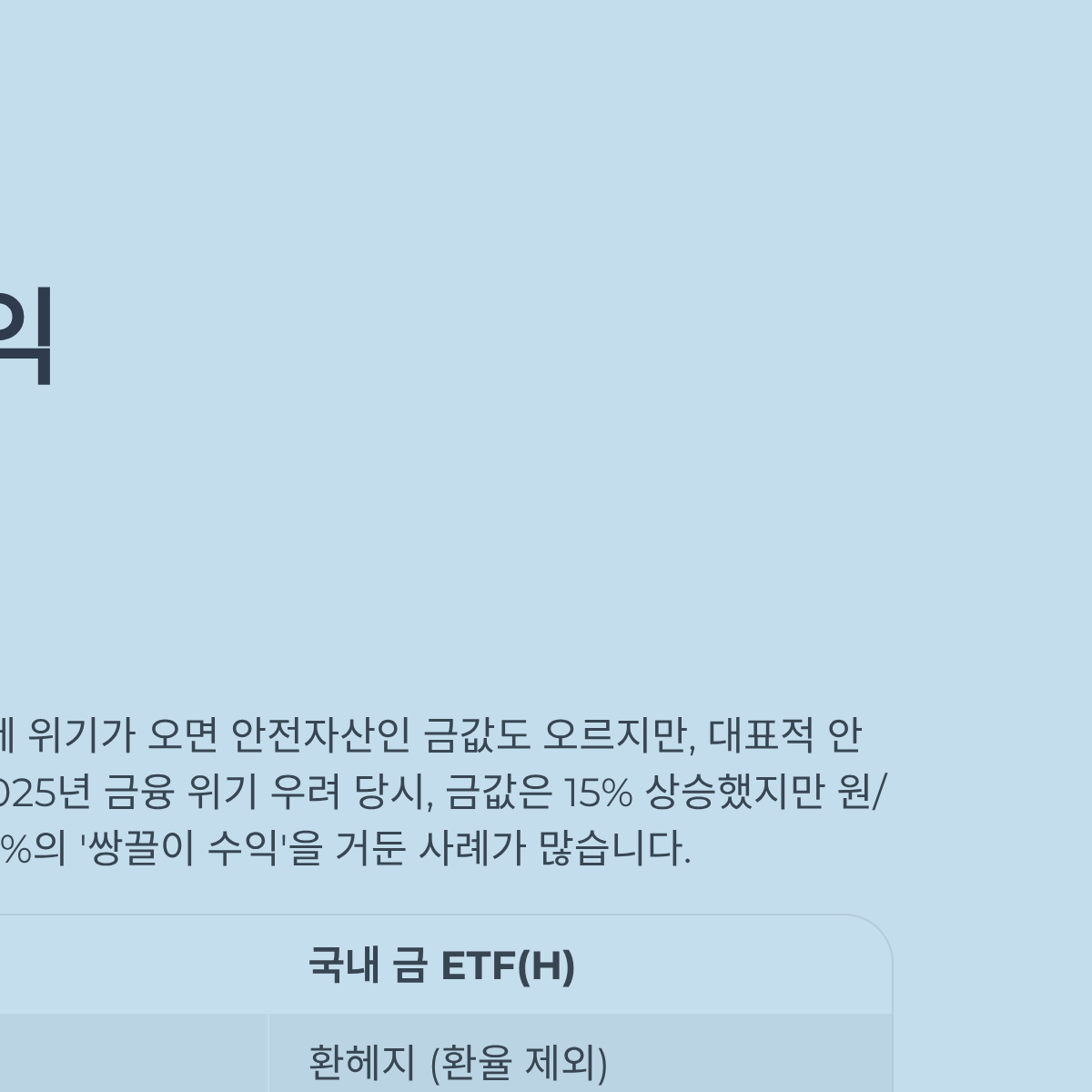 | 환율 효과 | 환노출 (금값 + 달러 수익) | 환헤지 (환율 변동 제외) | 위기 시 방어력 차이 |