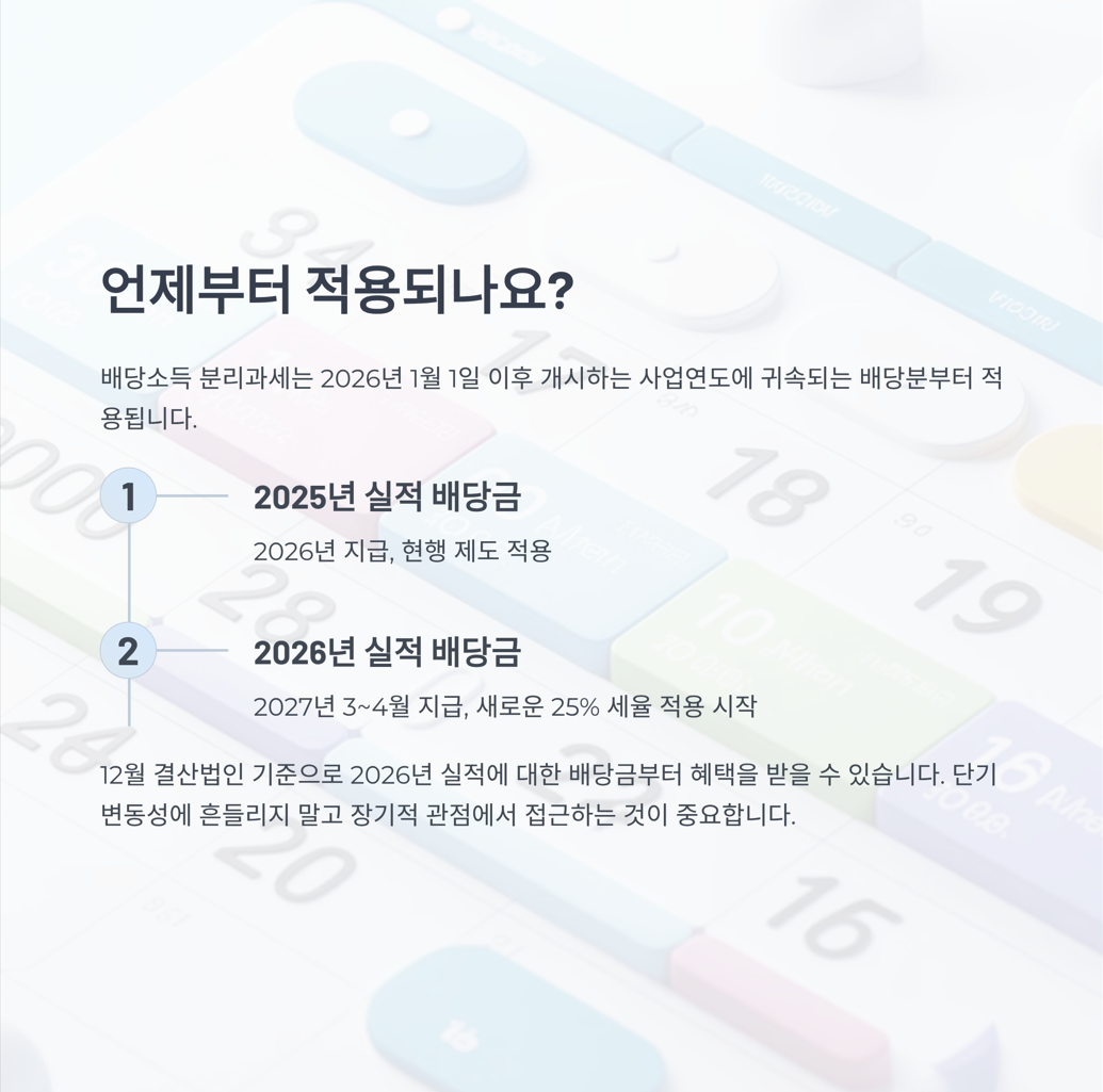 배당소득 분리과세는 2026년 1월 1일 이후 개시하는 사업연도에 귀속되는 배당분부터 적용됩니다. 즉, 12월 결산법인 기준으로 2026년 실적에 대한 배당금(2027년 3~4월 지급)부터 혜택을 받을 수 있습니다.