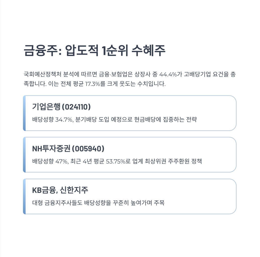 국회예산정책처 분석에 따르면 금융·보험업은 상장사 중 44.4%가 고배당기업 요건을 충족합니다. 이는 전체 평균 17.3%를 크게 웃도는 수치입니다. 안정적인 이익 구조와 정부의 주주환원 정책 압박이 맞물린 결과입니다.