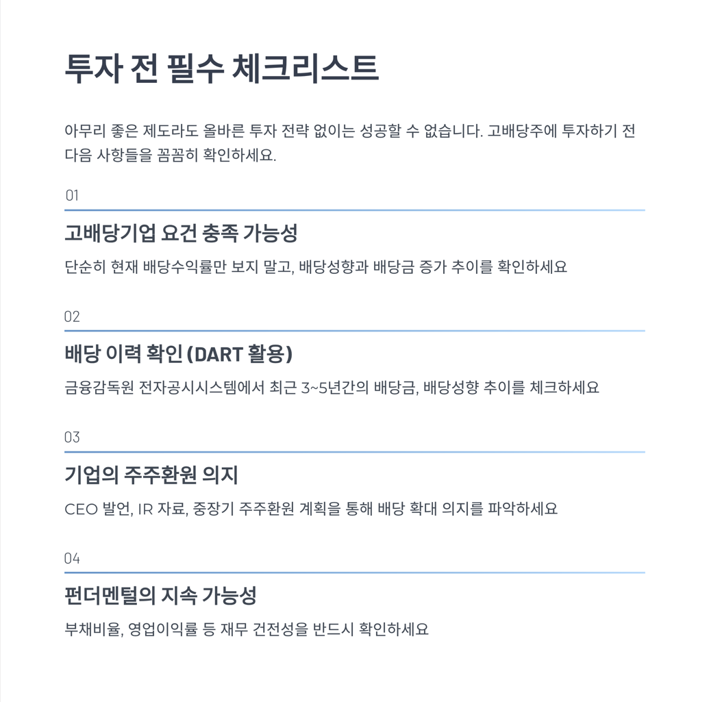아무리 좋은 제도라도 올바른 투자 전략 없이는 성공할 수 없습니다. 고배당주에 투자하기 전 다음 사항들을 꼼꼼히 확인하세요.