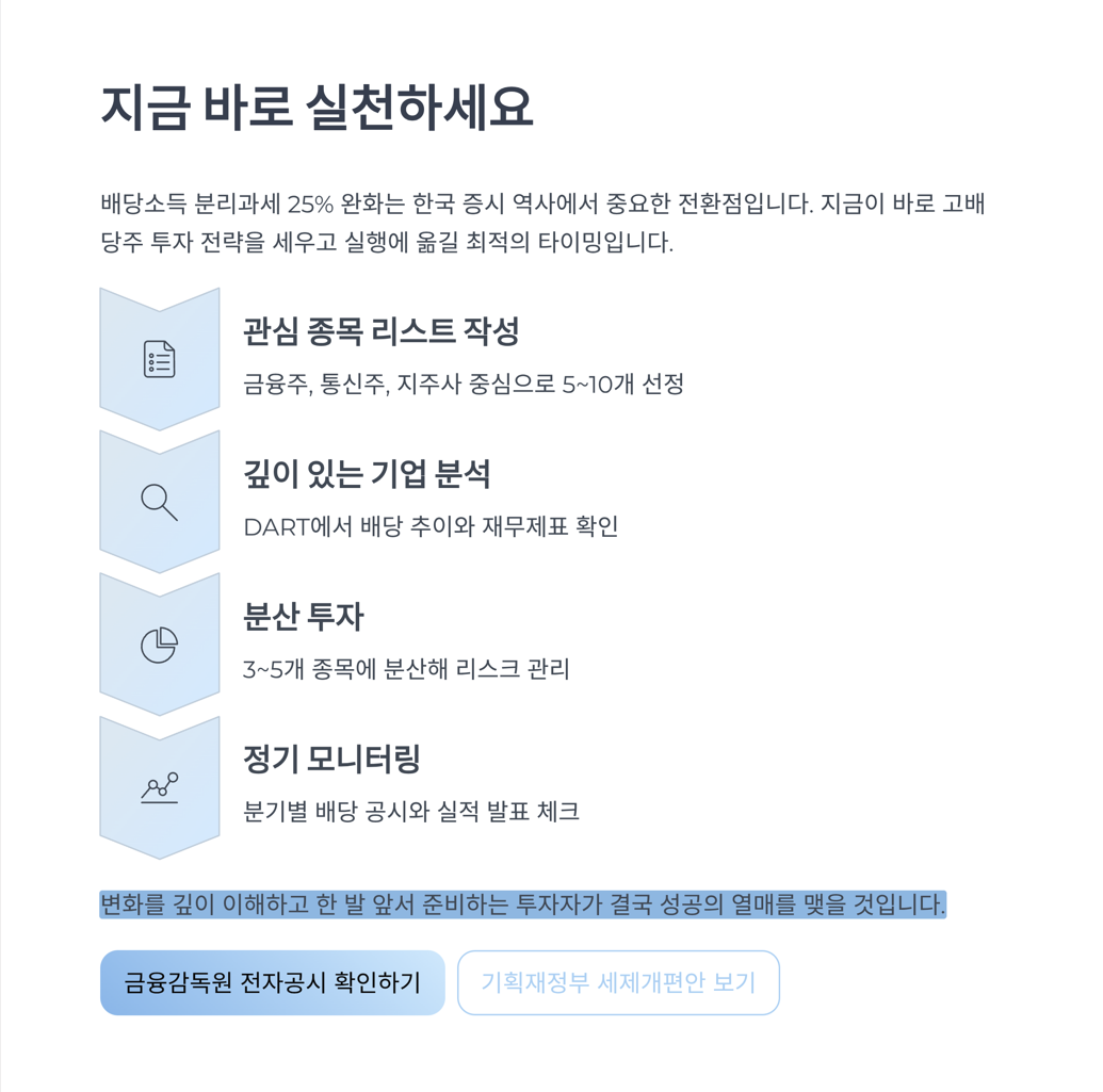 배당소득 분리과세 최고세율 25% 완화는 한국 증시 역사에서 중요한 전환점이 될 것입니다. 지난 수십 년간 배당에 인색했던 한국 기업들이 변화하고, 투자자들도 시세차익이 아닌 배당을 통한 안정적인 수익 창출에 눈을 돌리게 될 것입니다.