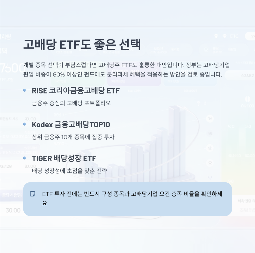 개별 종목 선택이 부담스럽다면 고배당주 ETF도 훌륭한 대안입니다. 정부는 고배당기업 편입 비중이 60% 이상인 펀드에도 분리과세 혜택을 적용하는 방안을 검토 중입니다. ETF에 투자하면 여러 고배당주에 분산투자하는 효과를 누릴 수 있어 리스크를 줄일 수 있습니다.
